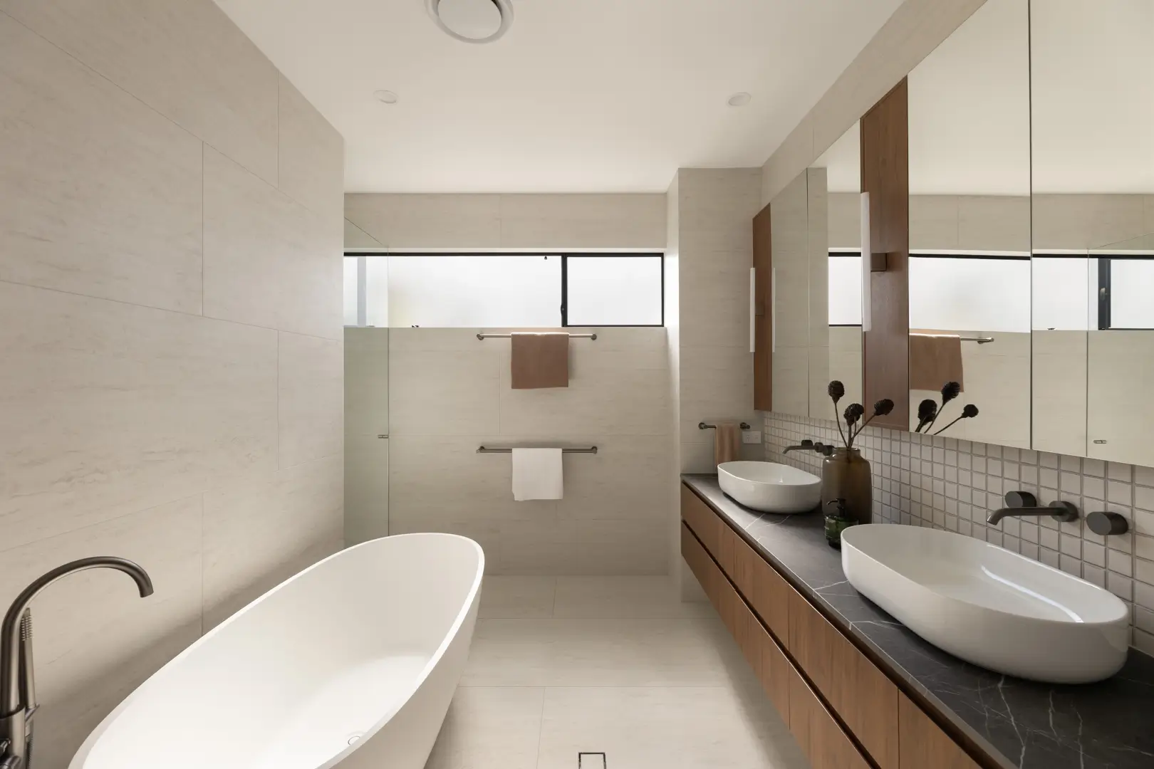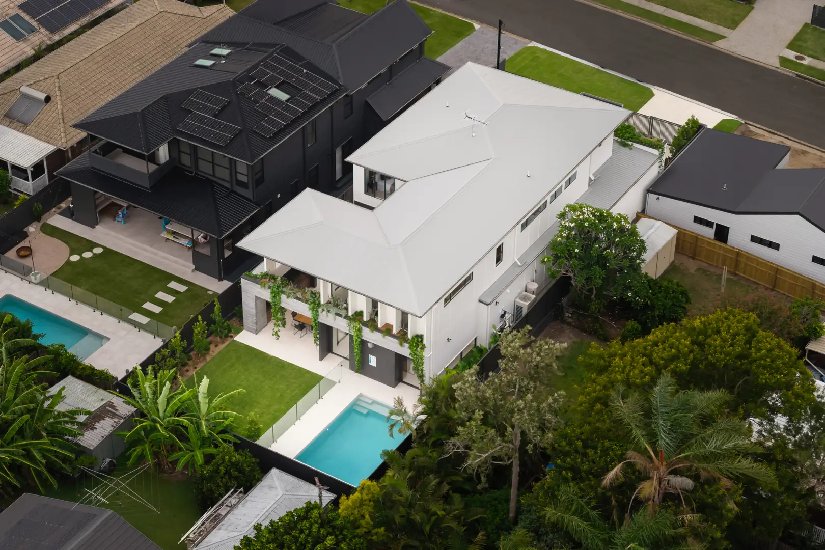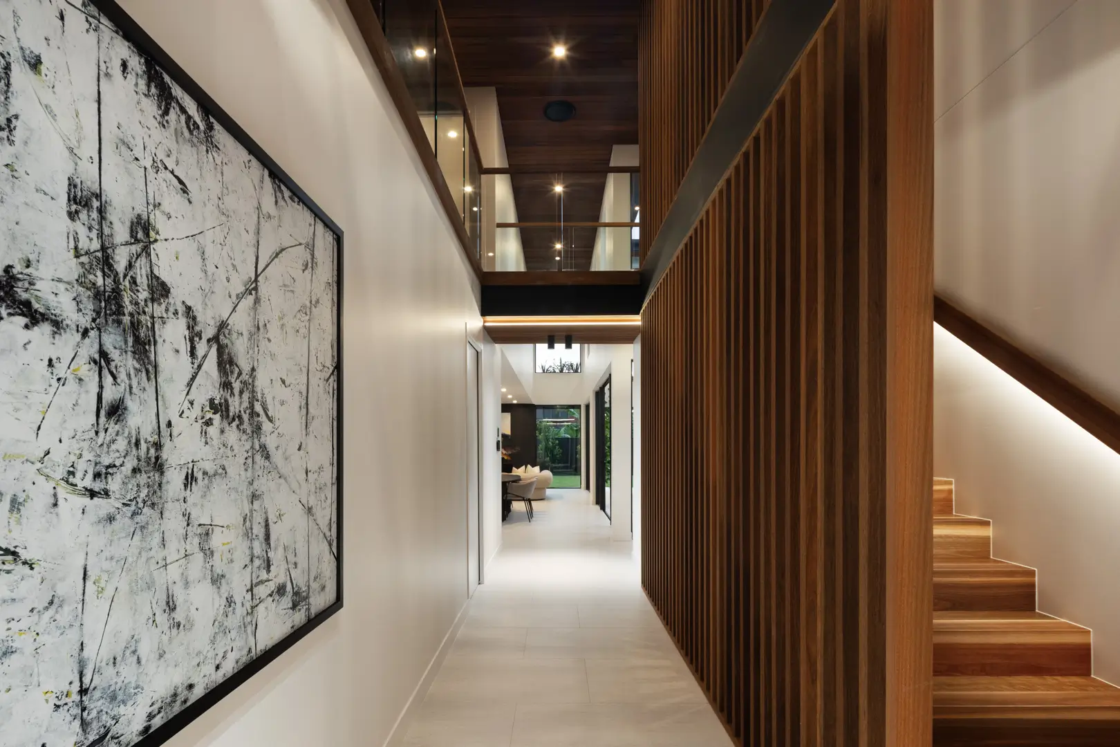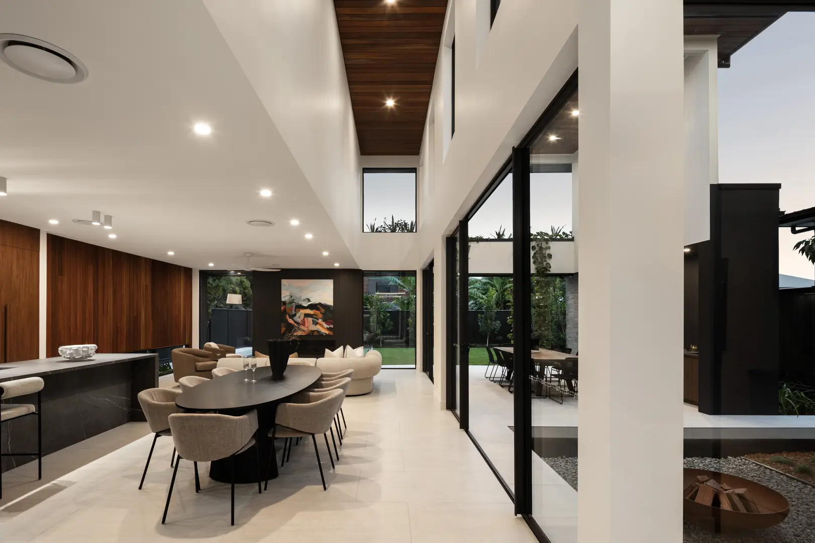 This architect-designed Brisbane home features double-height ceilings, a flowing open-plan layout, and a gallery walkway linking the levels. Natural light and ventilation are maximised throughout, with spotted gum detailing, stone and porcelain surfaces, and hanging gardens that add texture and warmth. The ground floor combines living, dining, and kitchen spaces with access to the courtyard and saltwater pool. The home includes five bedrooms, four with walk-in robes, and four bathrooms, including a master suite with dressing room, vanity, and ensuite. Additional spaces include a dedicated office, media room, guest powder room, and three-car garage with mudroom, all behind secure gates. Every element reflects considered proportions, material selection, and functional layout, delivering a custom family home that balances design and lifestyle.