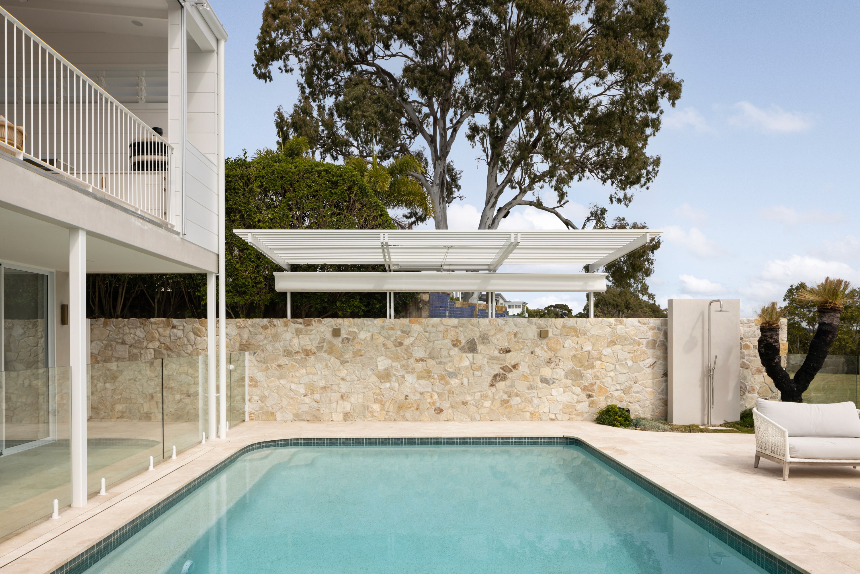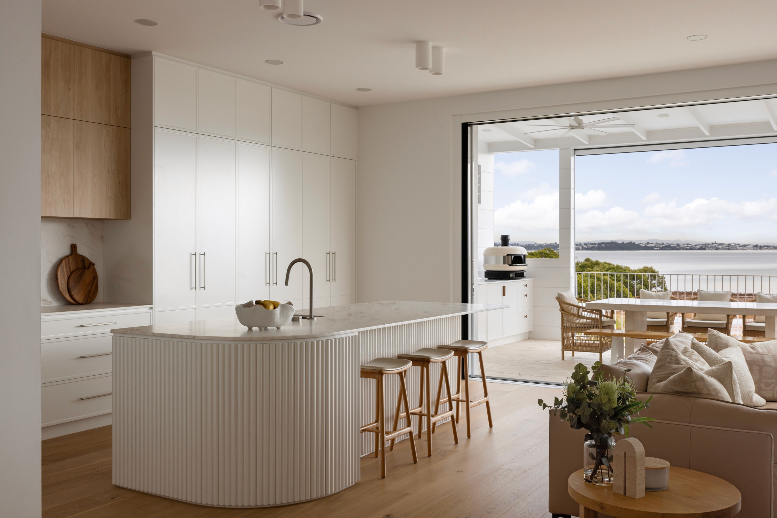 This modern coastal home blends indoor and outdoor luxury with white cladding, expansive windows, and natural light. The open-plan design features a gourmet kitchen, a wellness area with a sauna and gym, and an alfresco dining space with water views and a built-in BBQ. A sun-drenched pool completes this harmonious retreat.