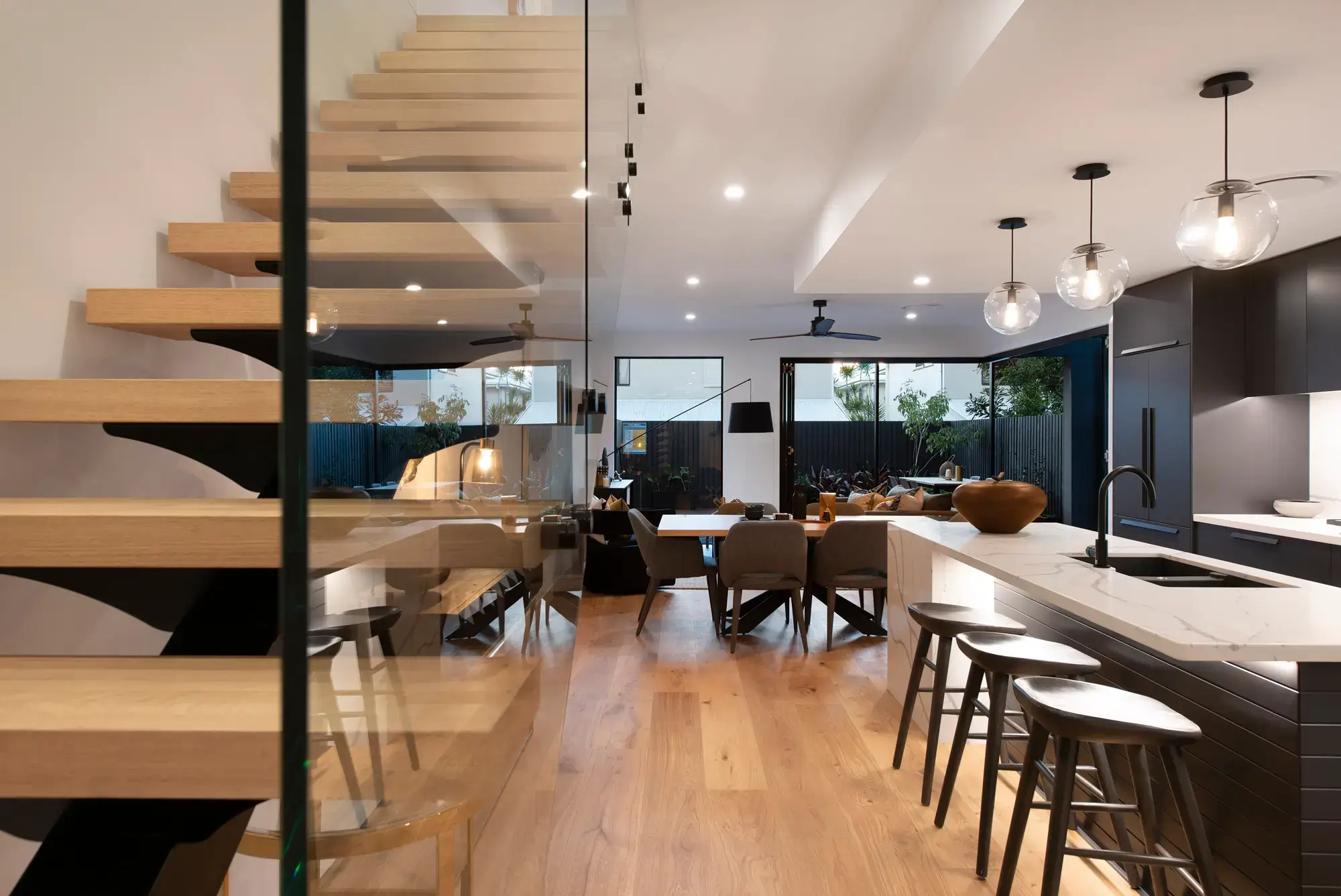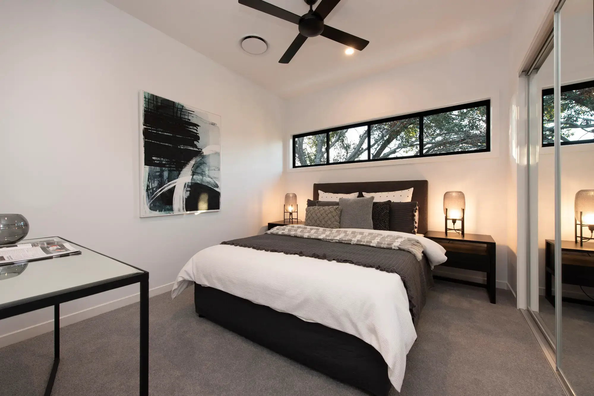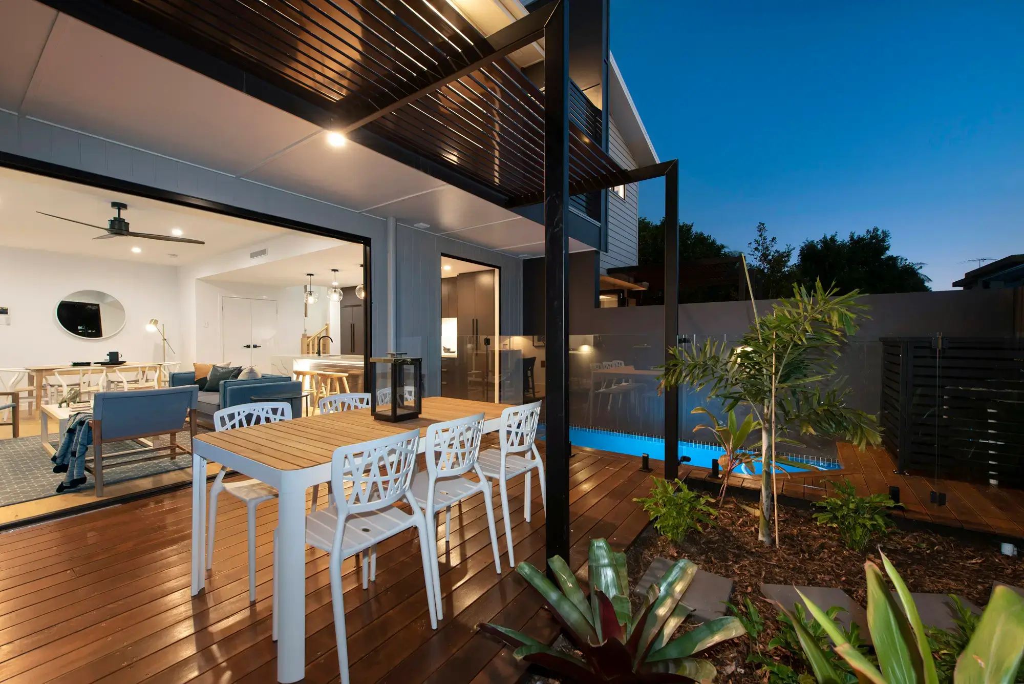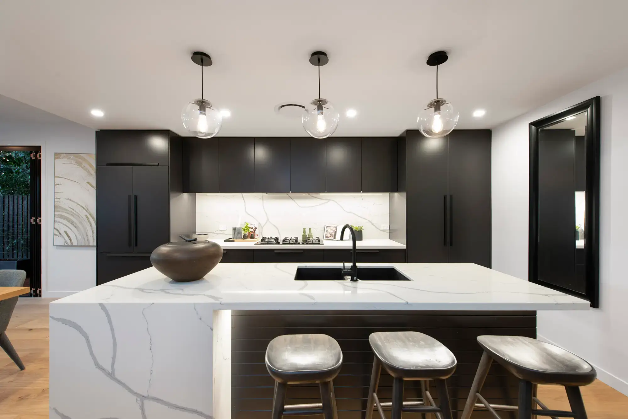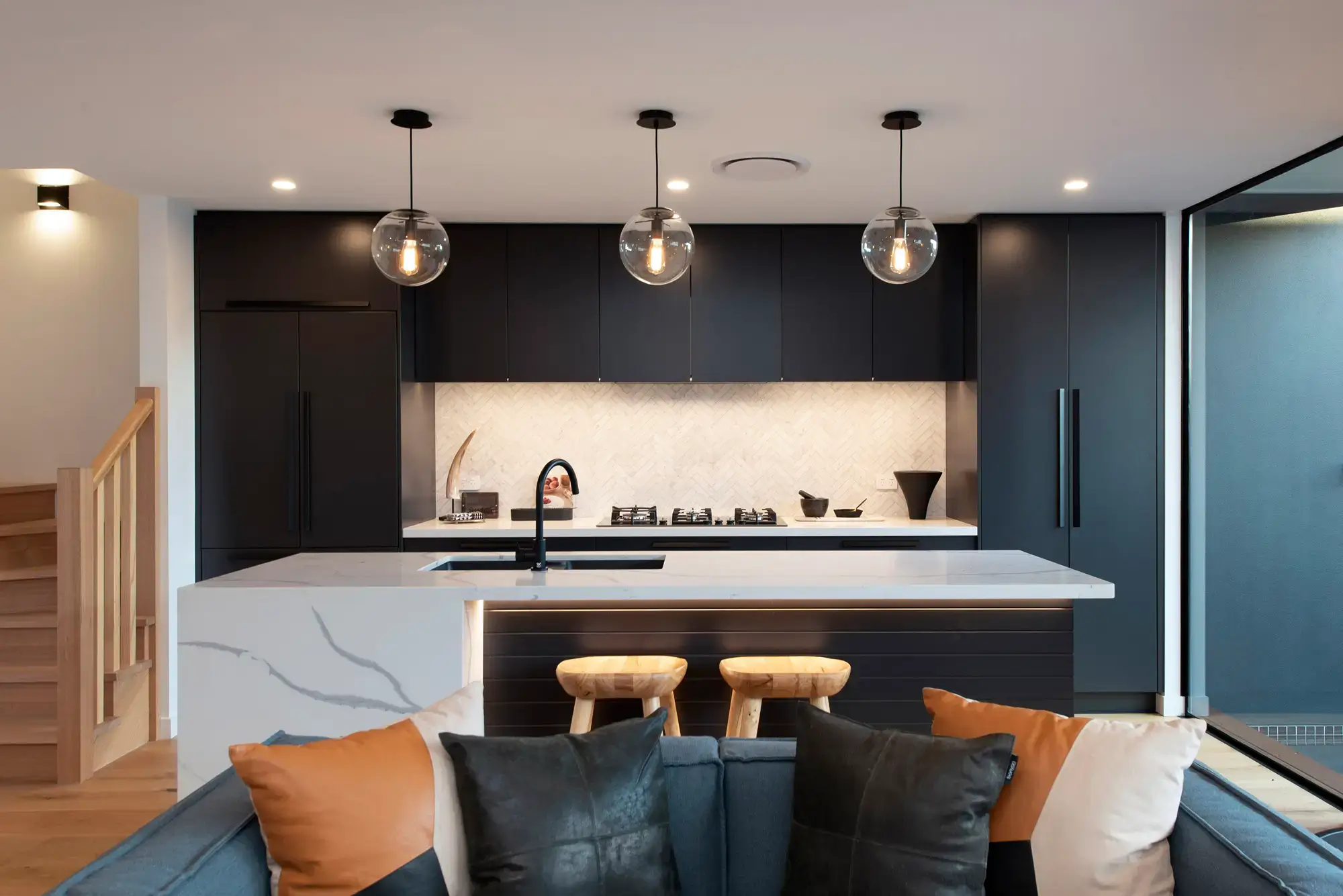 Bilyana Townhouses offer a modern, urban design. The kitchen features a sophisticated black-and-white palette with marble benchtops and minimalist cabinetry. The open-plan living area extends to an outdoor deck with timber flooring and greenery, perfect for alfresco dining. The master suite includes a dark feature wall, walk-in robe, and luxurious bathrooms.