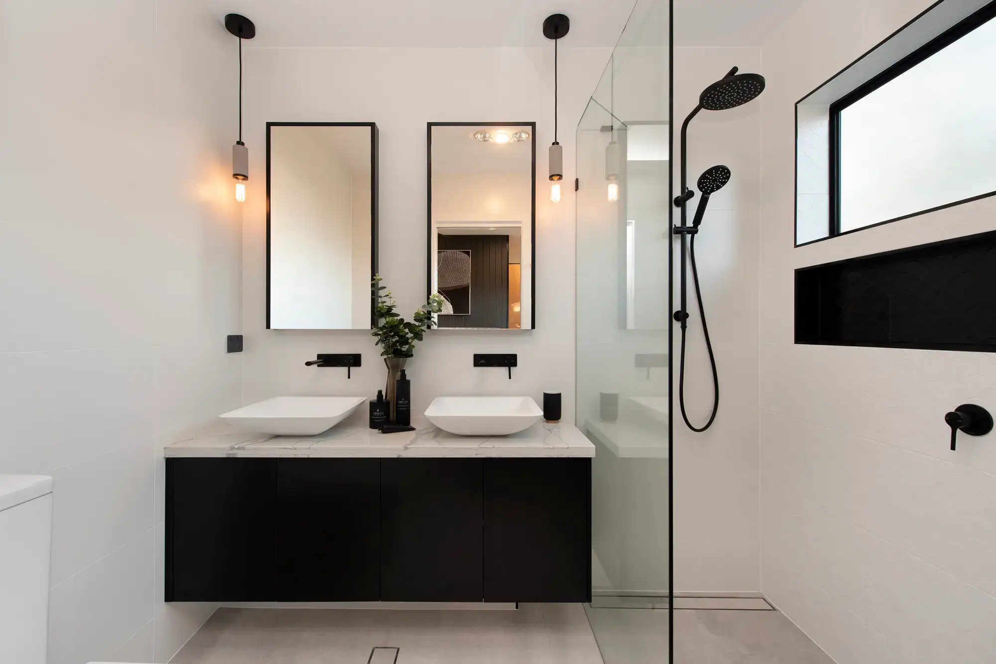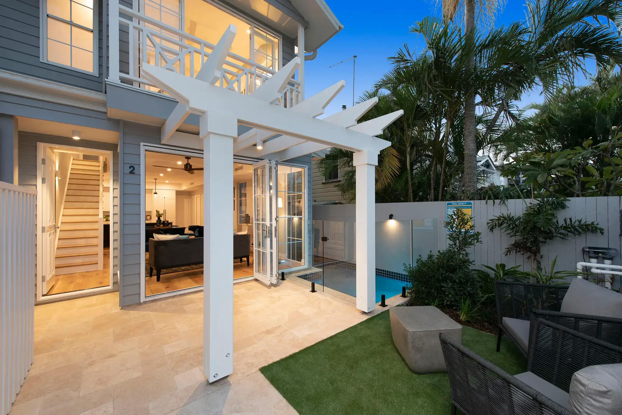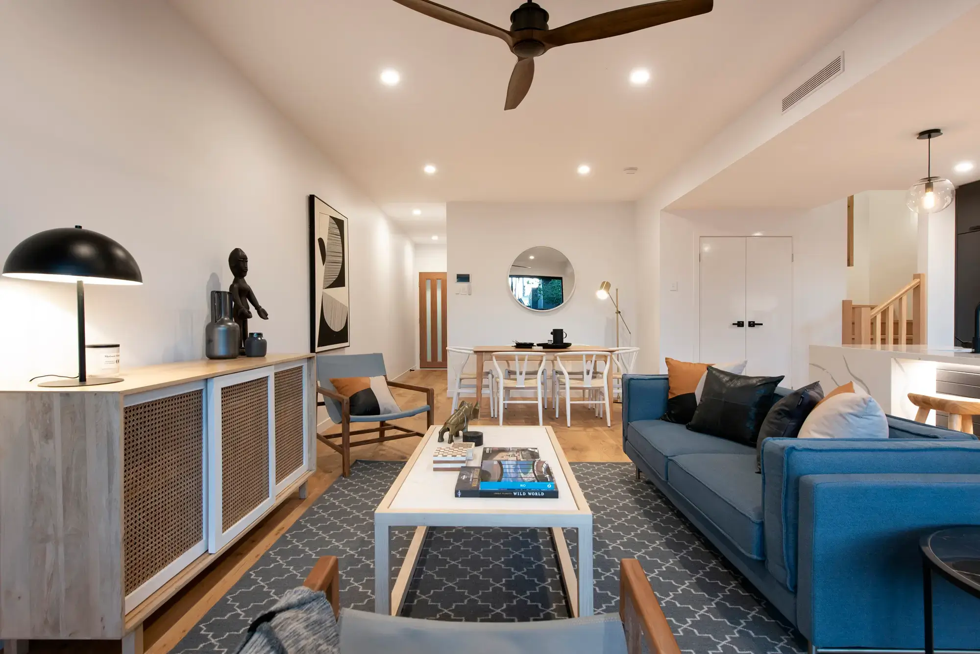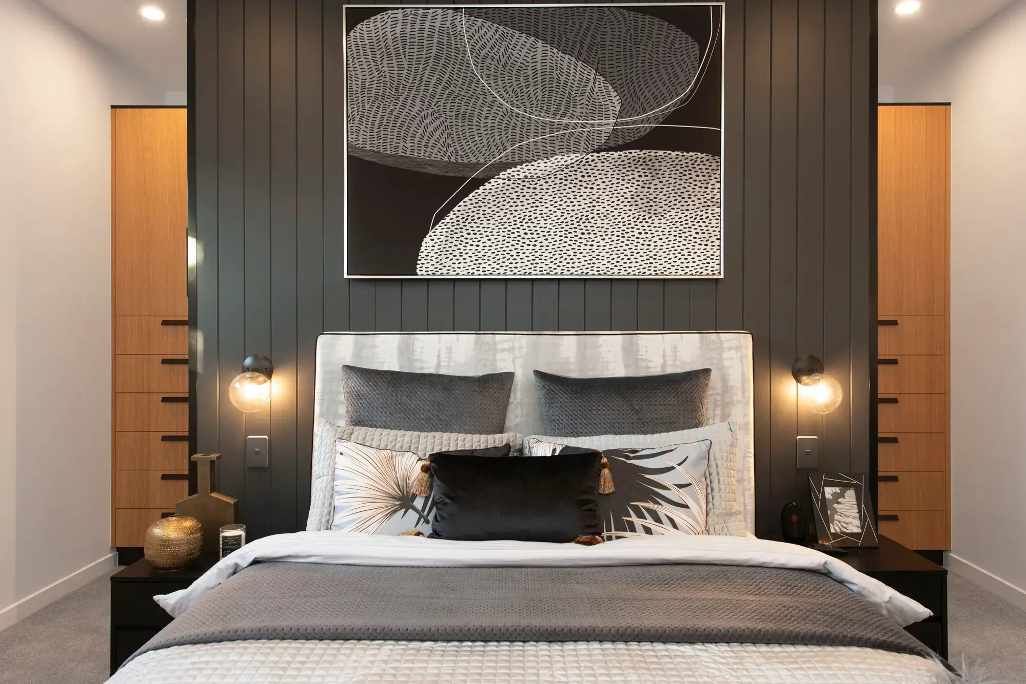 Bilyana Townhouses offer a modern, urban design. The kitchen features a sophisticated black-and-white palette with marble benchtops and minimalist cabinetry. The open-plan living area extends to an outdoor deck with timber flooring and greenery, perfect for alfresco dining. The master suite includes a dark feature wall, walk-in robe, and luxurious bathrooms.