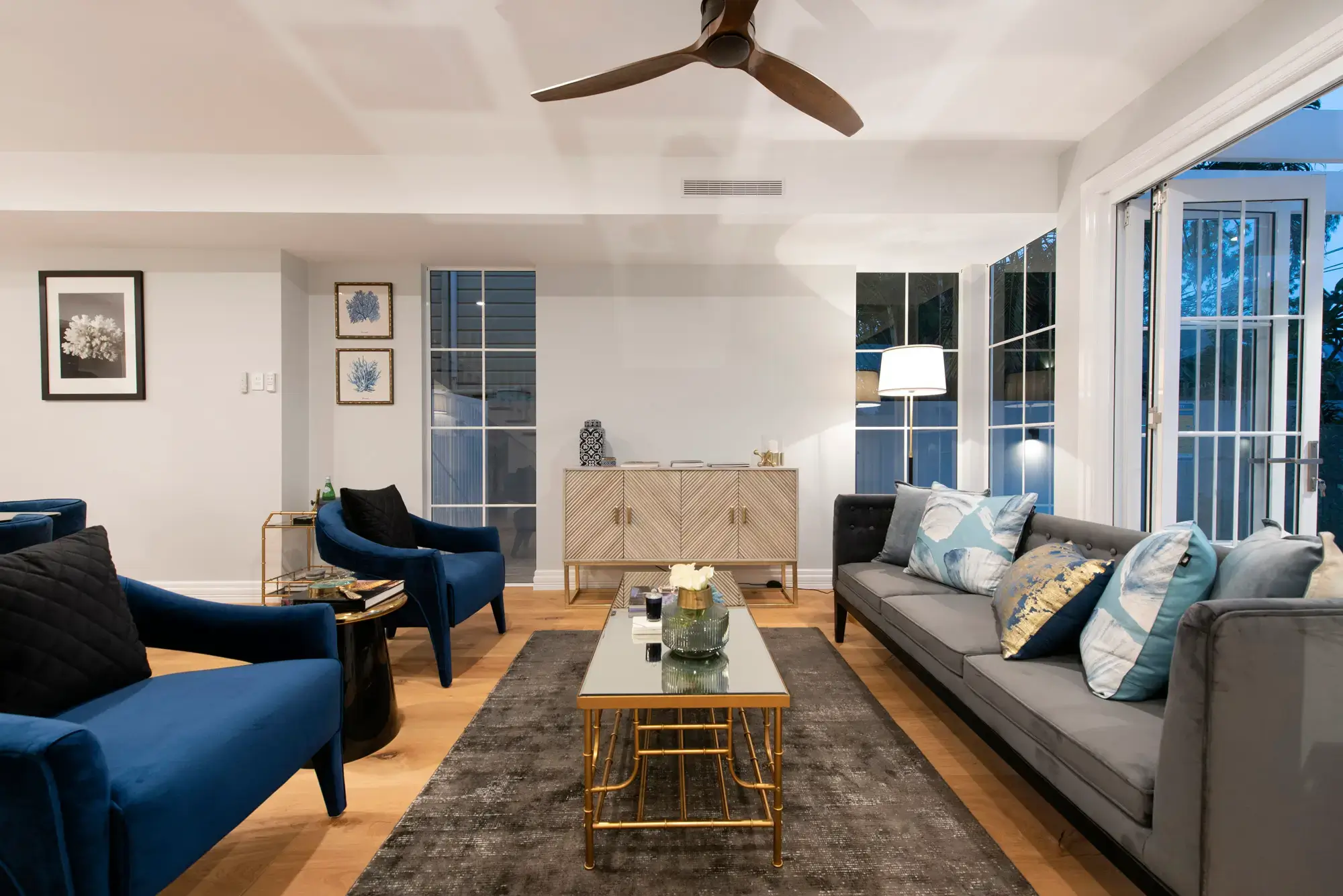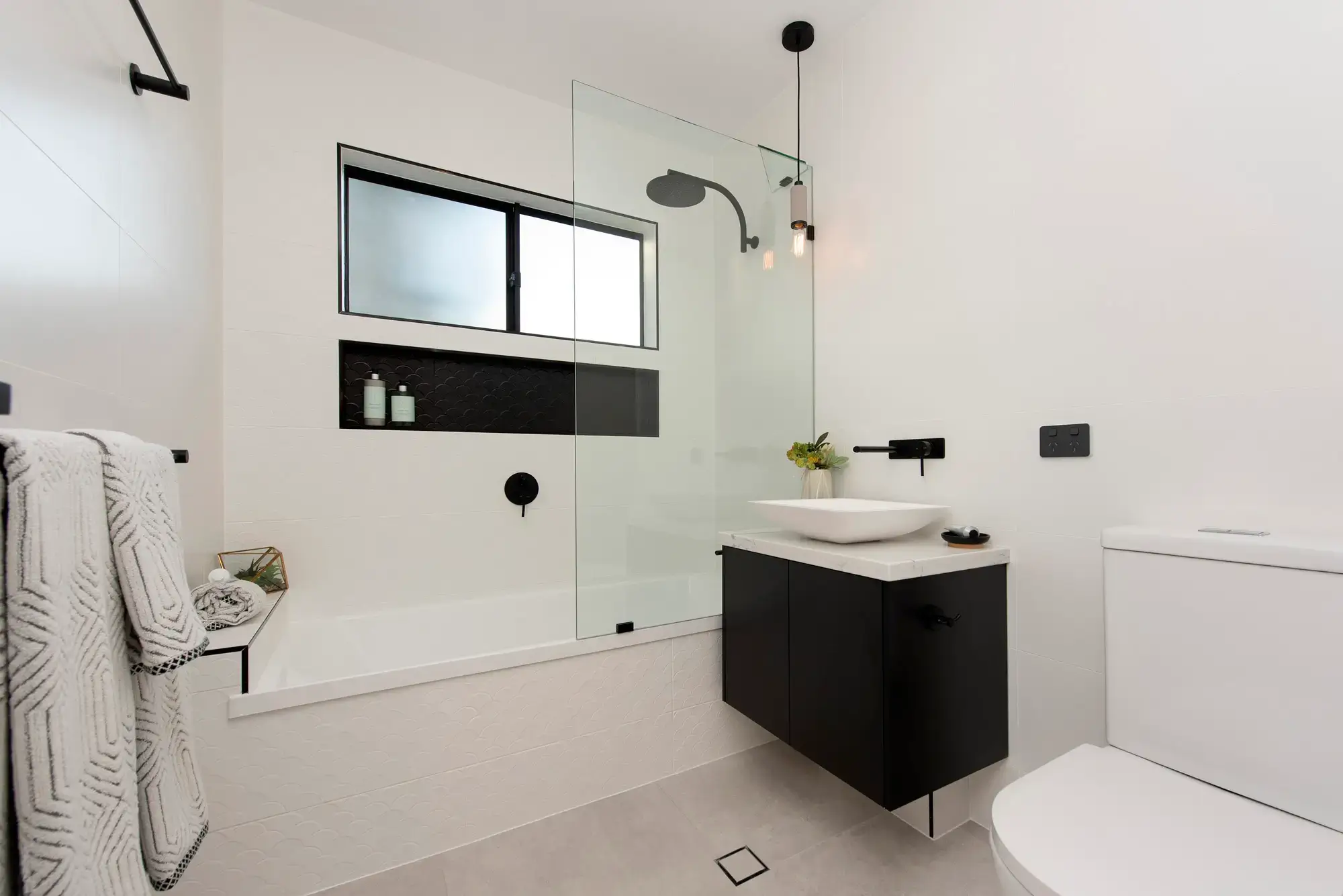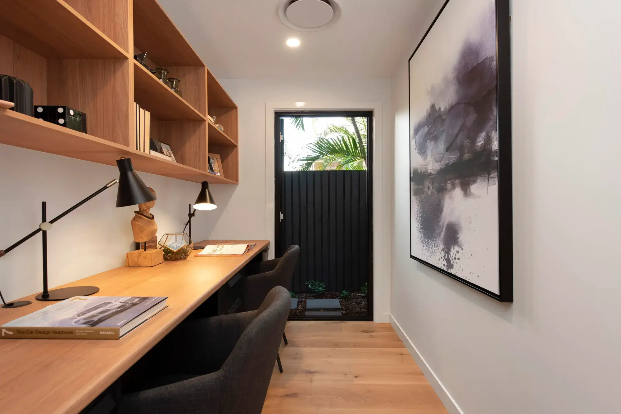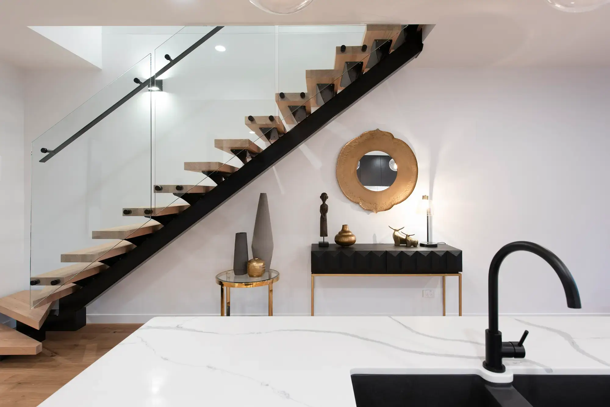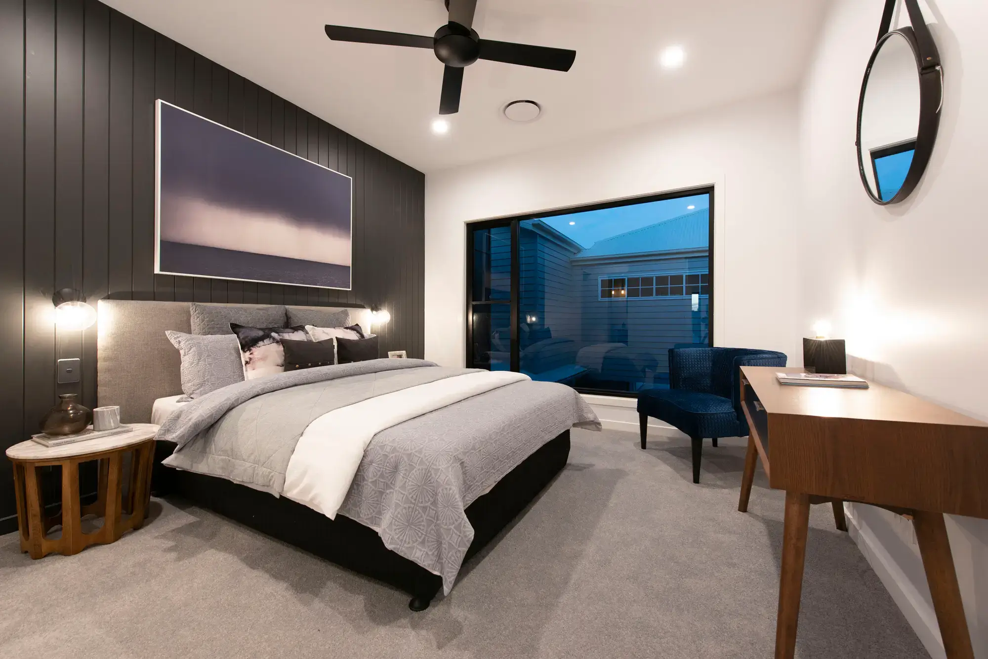 Bilyana Townhouses offer a modern, urban design. The kitchen features a sophisticated black-and-white palette with marble benchtops and minimalist cabinetry. The open-plan living area extends to an outdoor deck with timber flooring and greenery, perfect for alfresco dining. The master suite includes a dark feature wall, walk-in robe, and luxurious bathrooms.