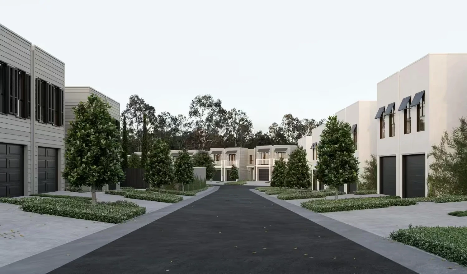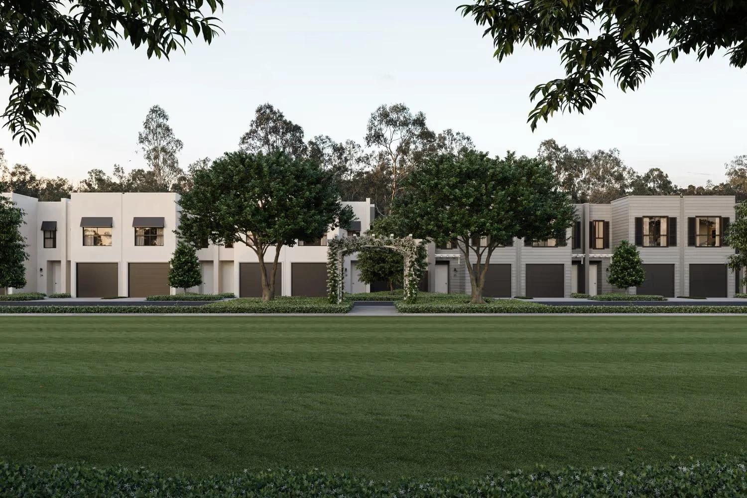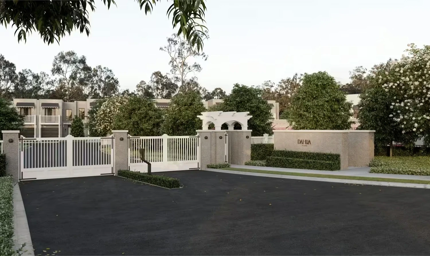 DAHLIA: 129 townhouses under construction at 10 Astral Court, Flinders View. These 3-bedroom terraces offer indoor-outdoor living, manicured gardens, and communal amenities like a 15m pool and children's splash pool. Located in a well-connected area, the homes feature refined architecture and sophisticated interiors with quality finishes.