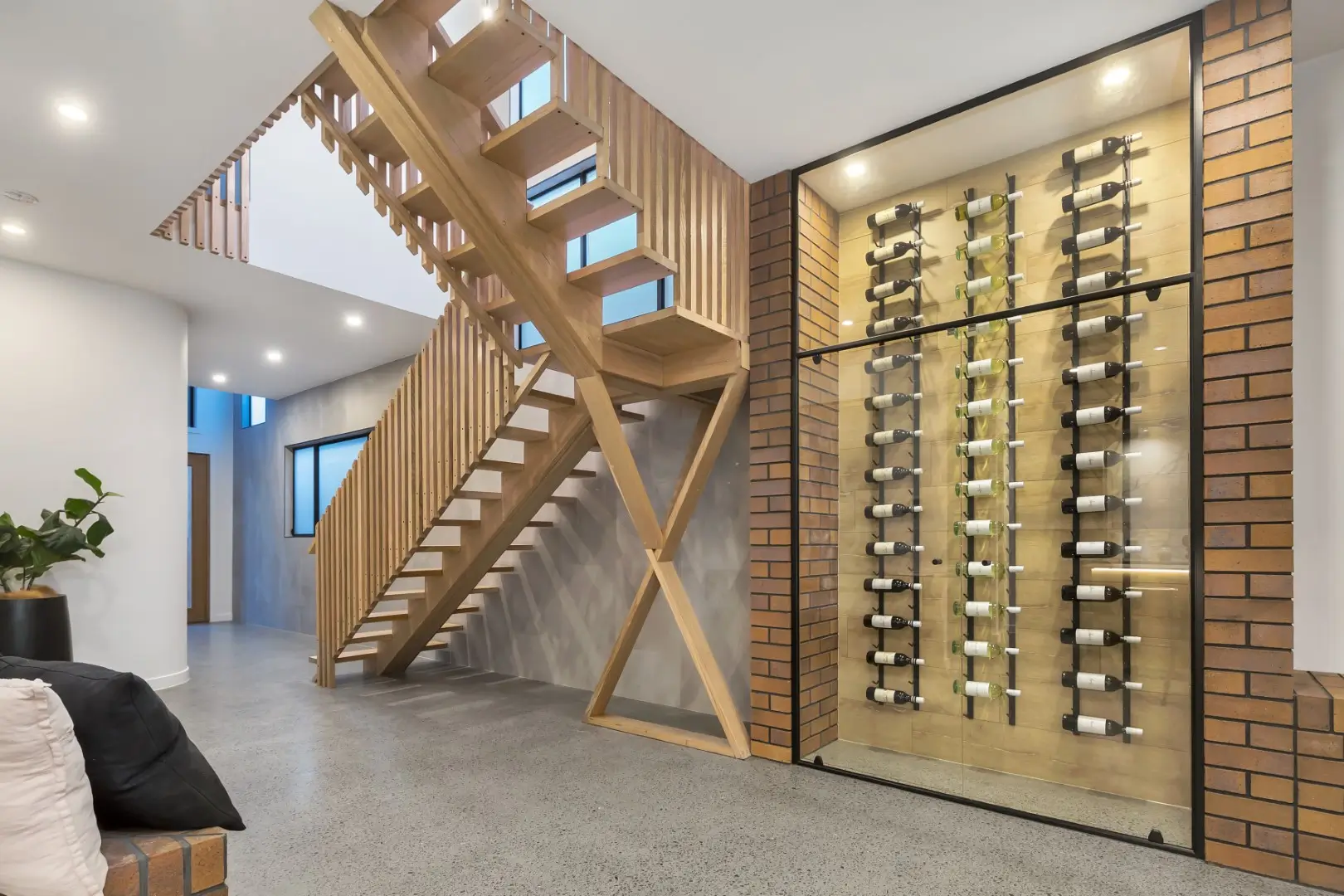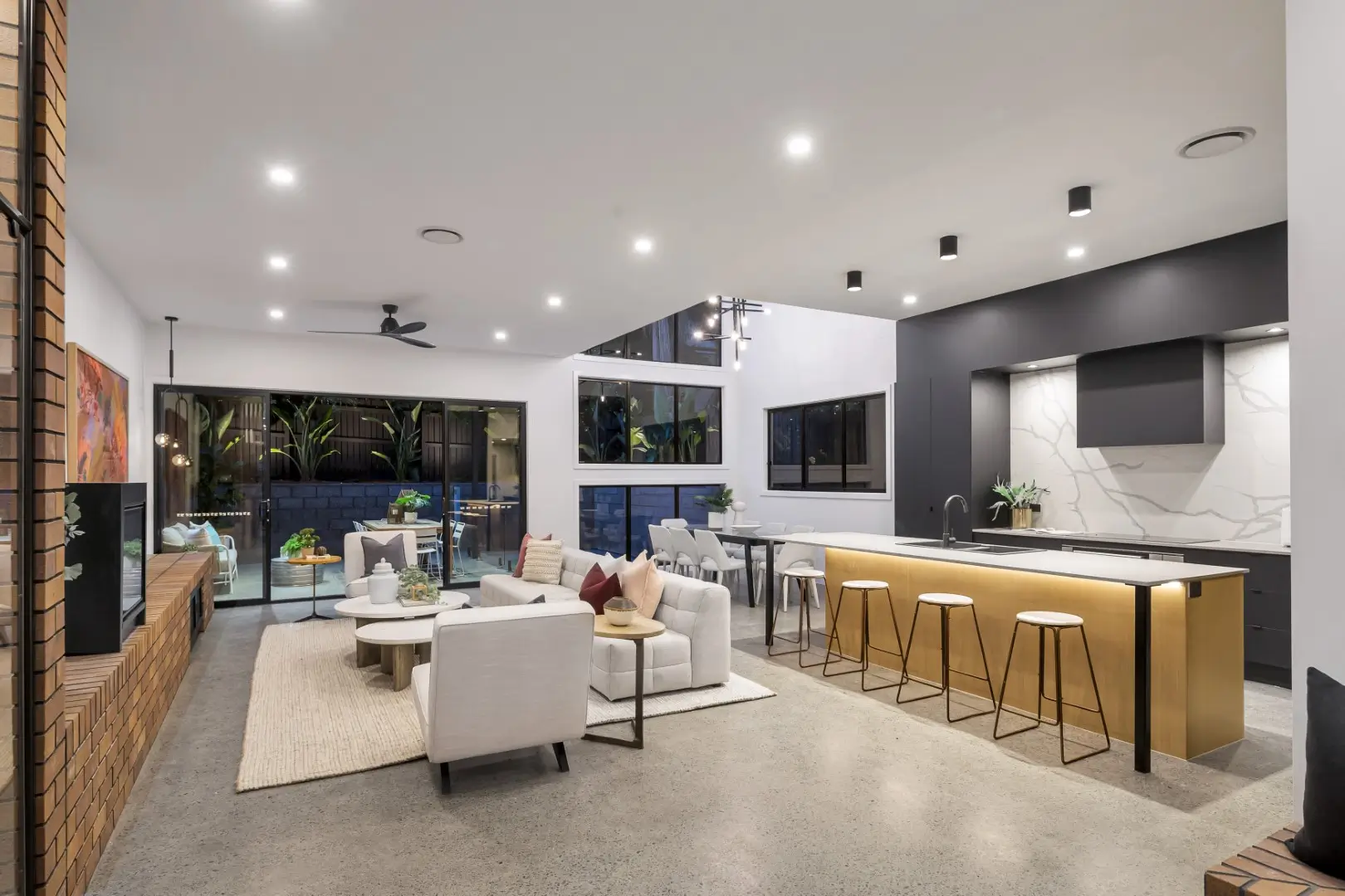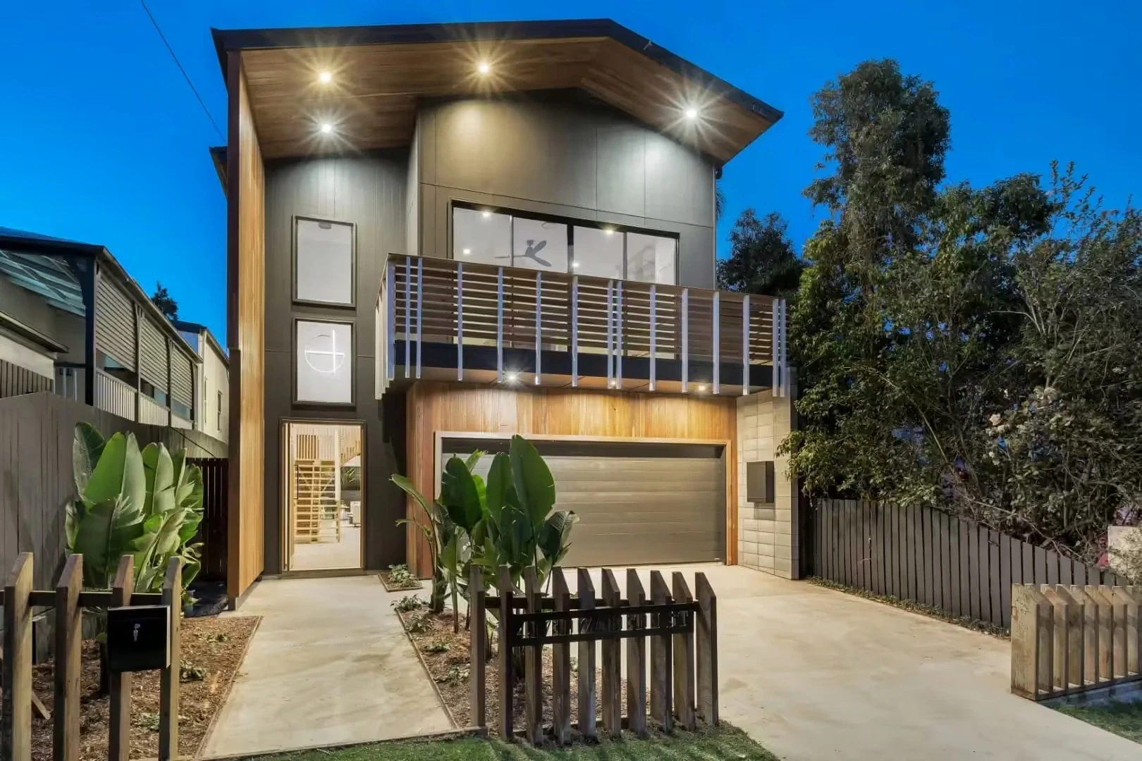 This luxurious home features a striking facade of timber and sleek materials. Inside, an open-plan layout includes a gourmet kitchen, a living area with a dramatic ceiling void, polished concrete floors, and a wine cellar. Four bedrooms, including a master suite, offer refined spaces. Outdoors, a covered courtyard, pool, and gardens provide a private oasis.