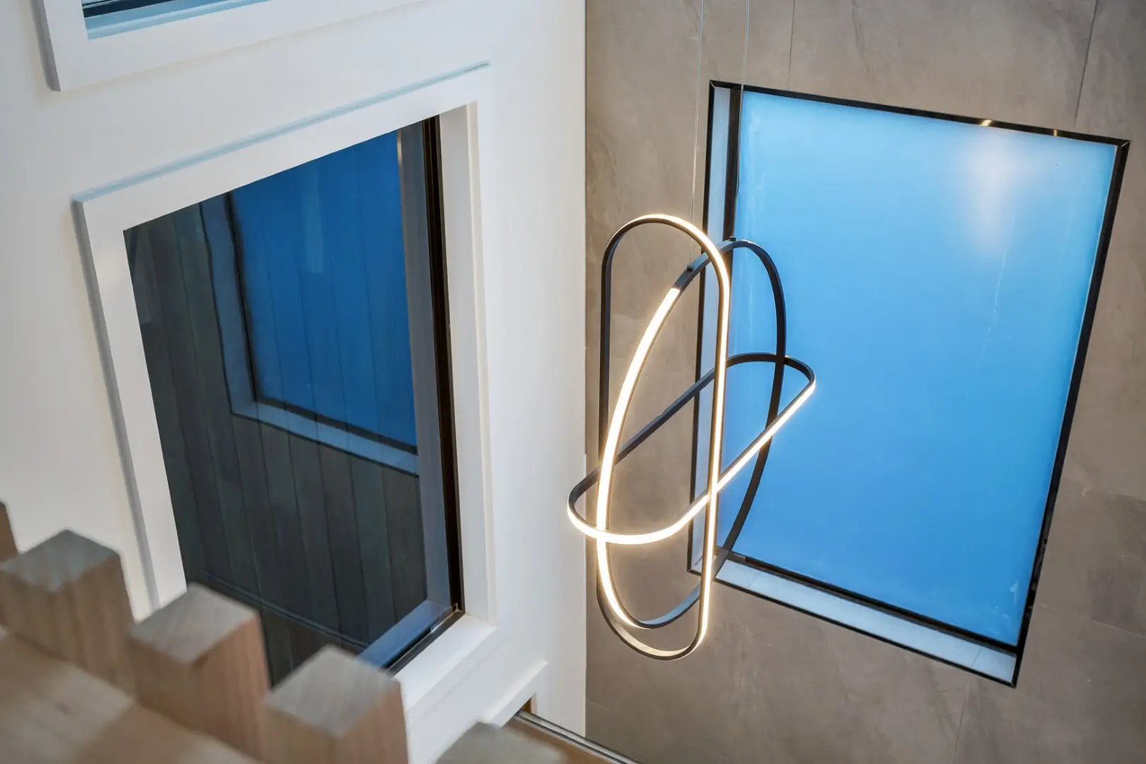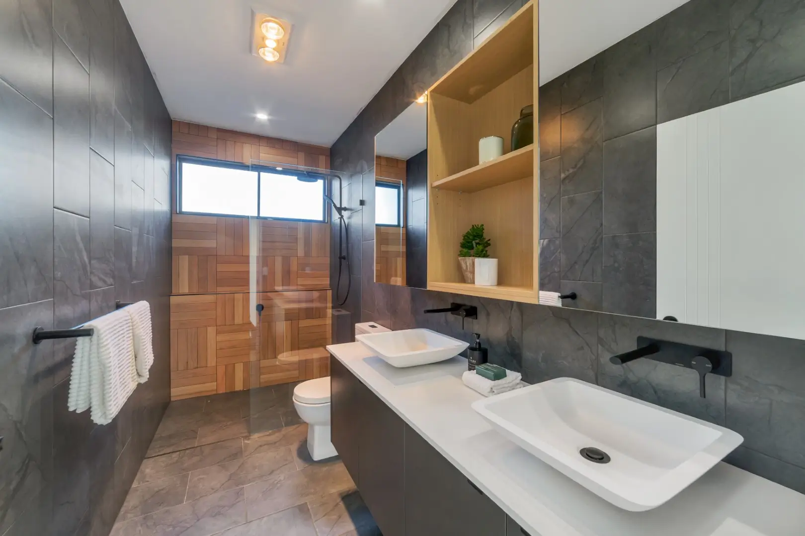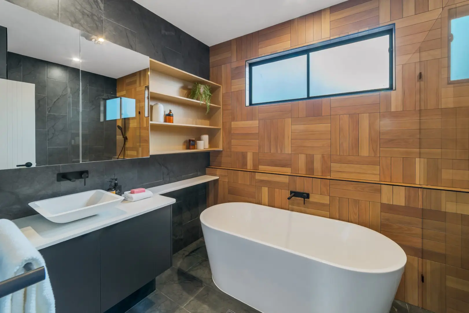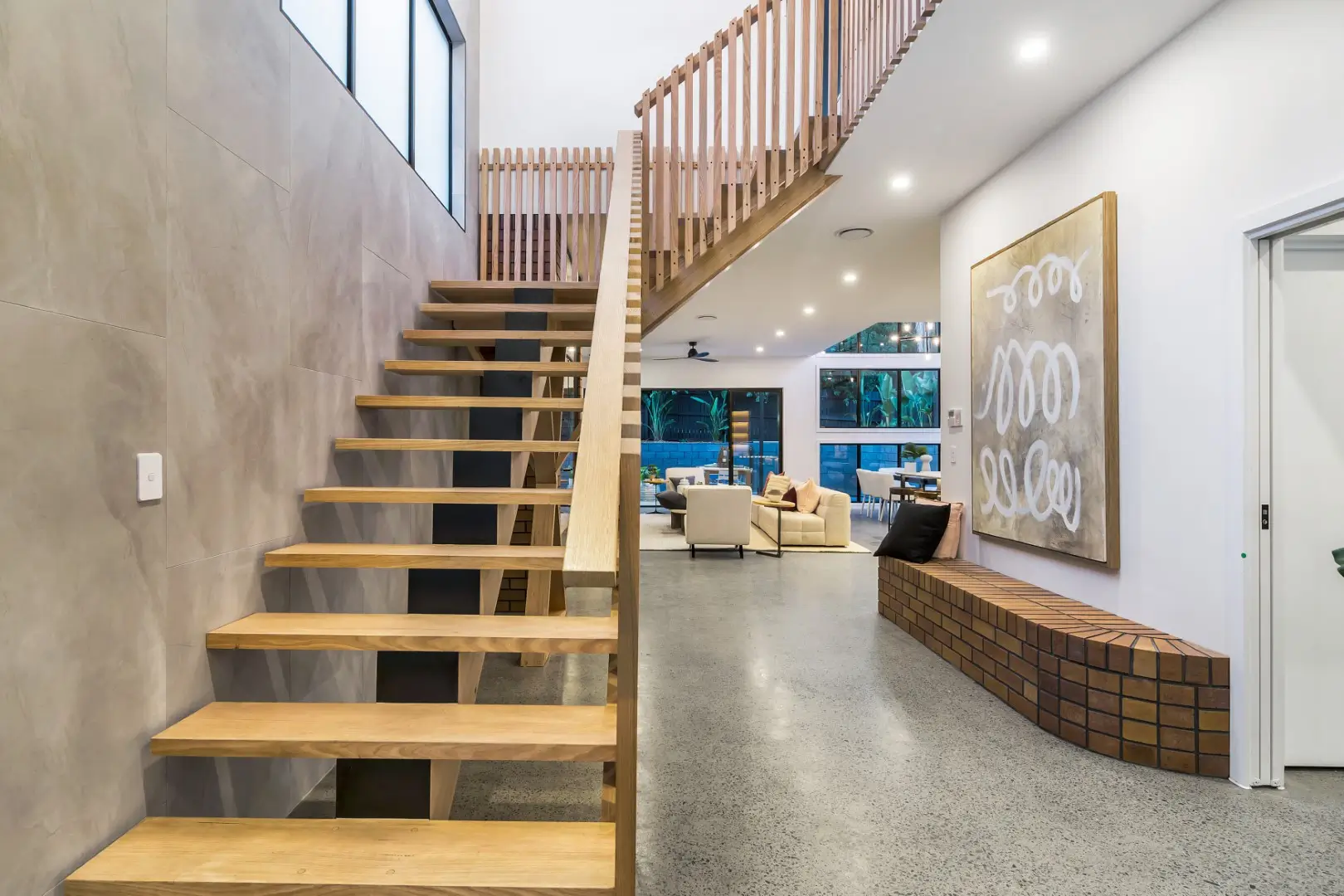 This luxurious home features a striking facade of timber and sleek materials. Inside, an open-plan layout includes a gourmet kitchen, a living area with a dramatic ceiling void, polished concrete floors, and a wine cellar. Four bedrooms, including a master suite, offer refined spaces. Outdoors, a covered courtyard, pool, and gardens provide a private oasis.