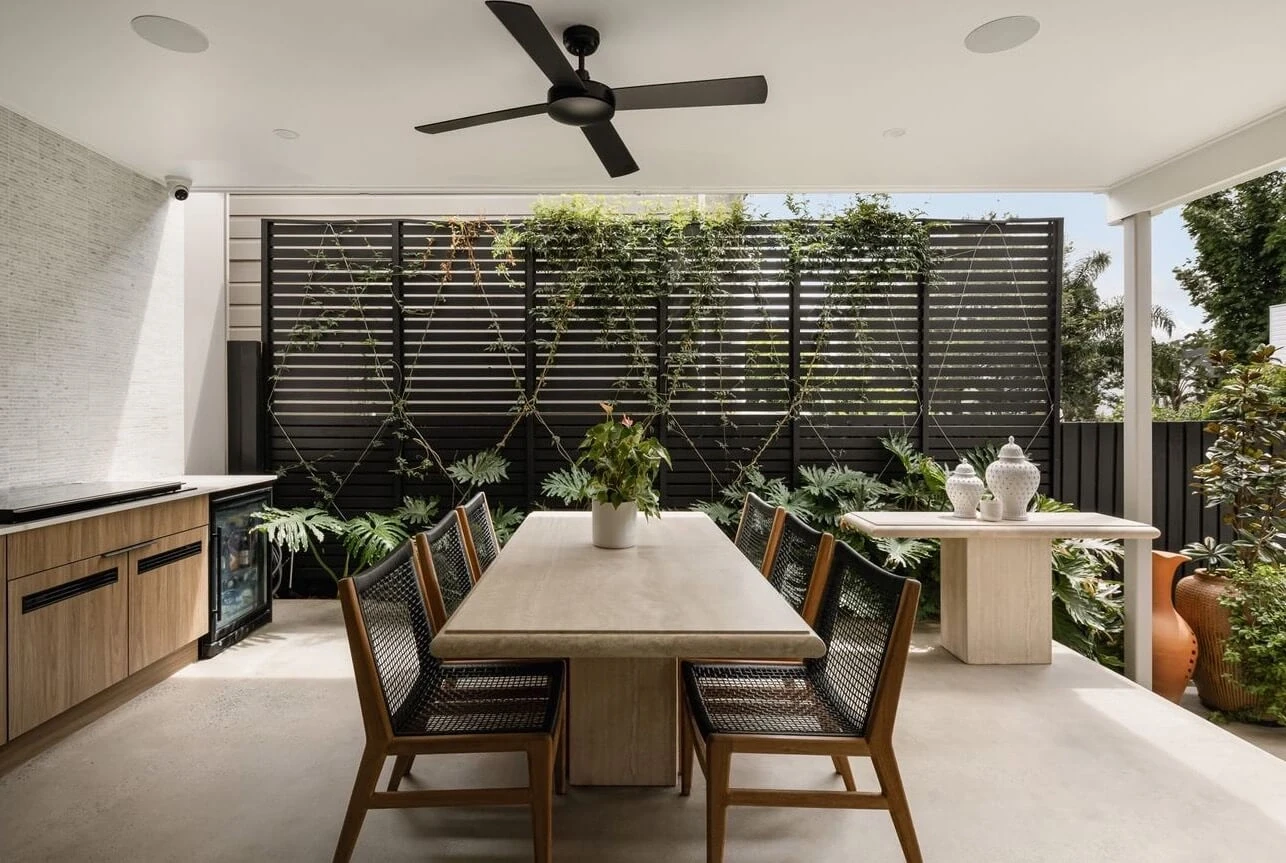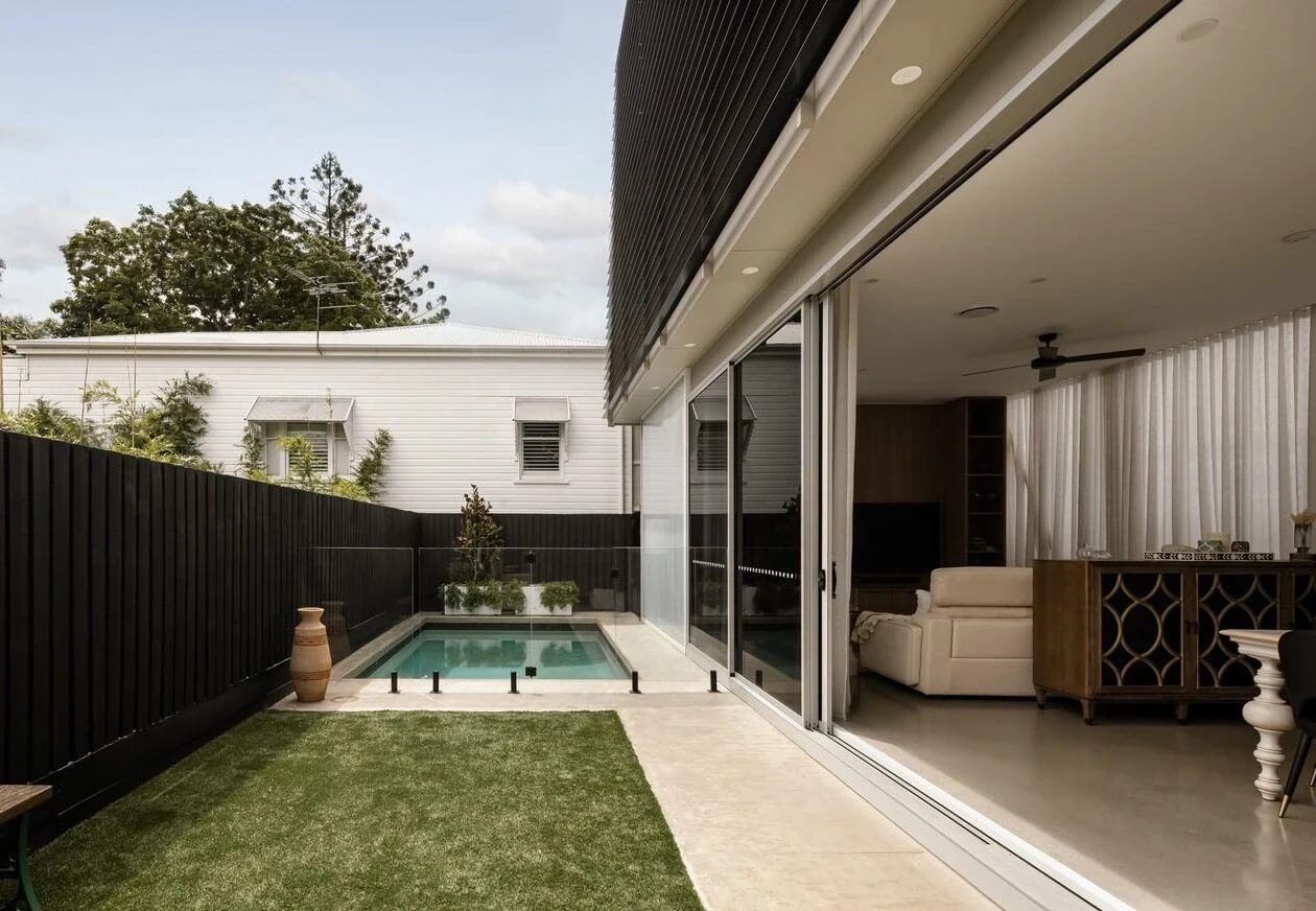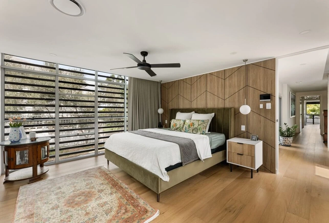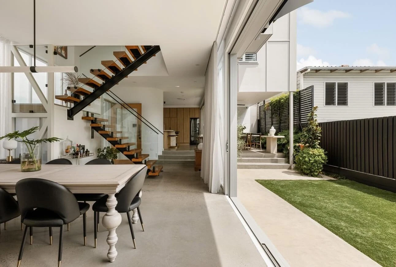 Kingsholme House offers contemporary, open-plan living with abundant natural light. The standout kitchen features stone benchtops and a large island. Five bedrooms include a master suite with a walk-in robe and ensuite. Outdoor living extends to an alfresco area with a pool, and a rooftop terrace provides city views.