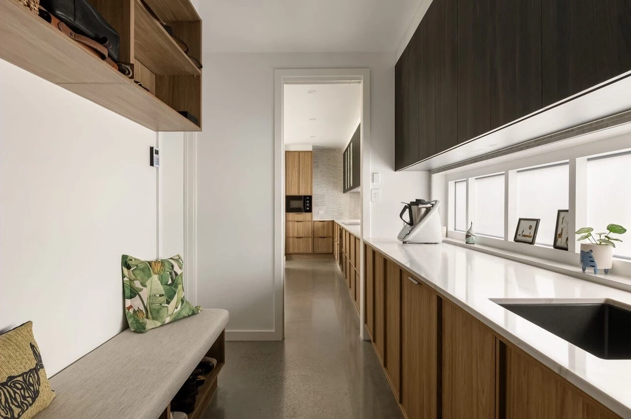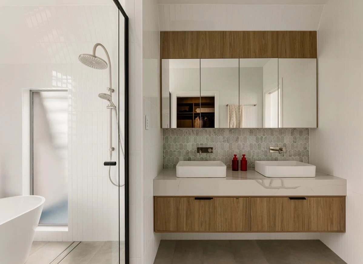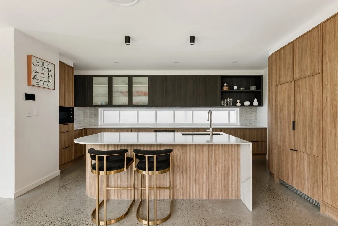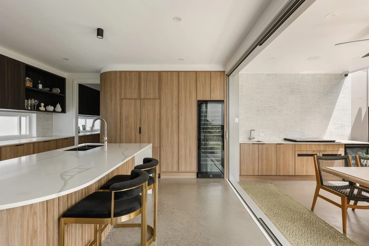 Kingsholme House offers contemporary, open-plan living with abundant natural light. The standout kitchen features stone benchtops and a large island. Five bedrooms include a master suite with a walk-in robe and ensuite. Outdoor living extends to an alfresco area with a pool, and a rooftop terrace provides city views.