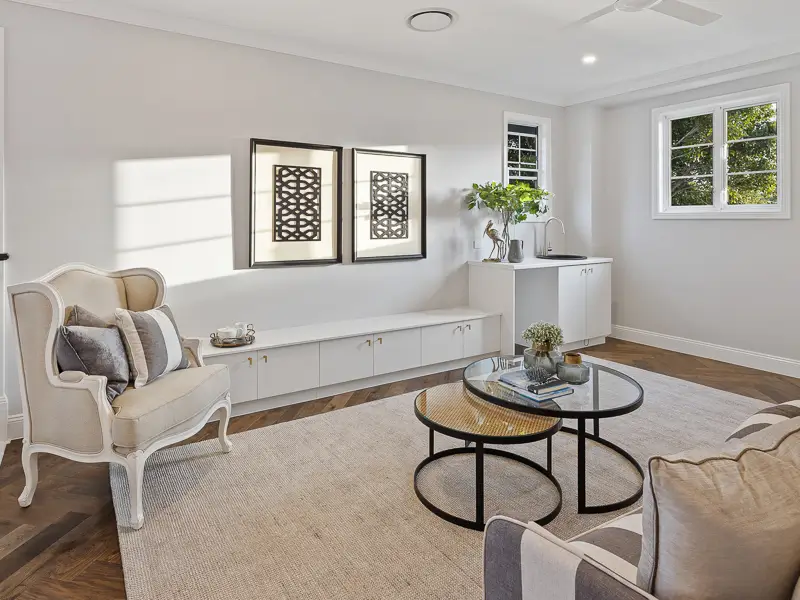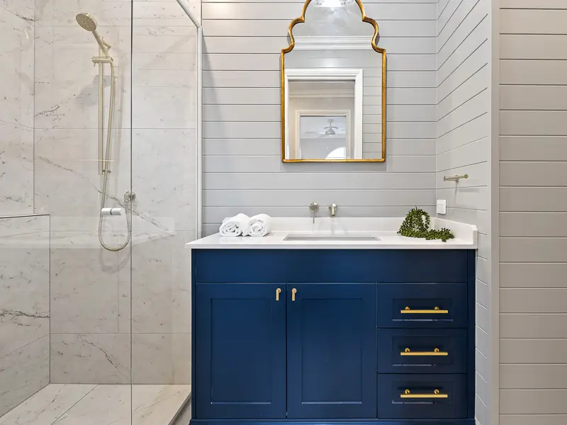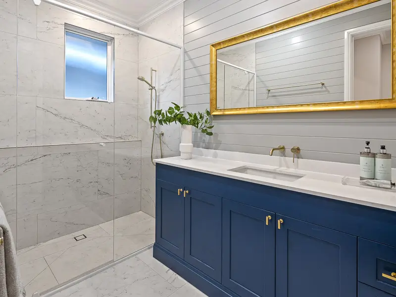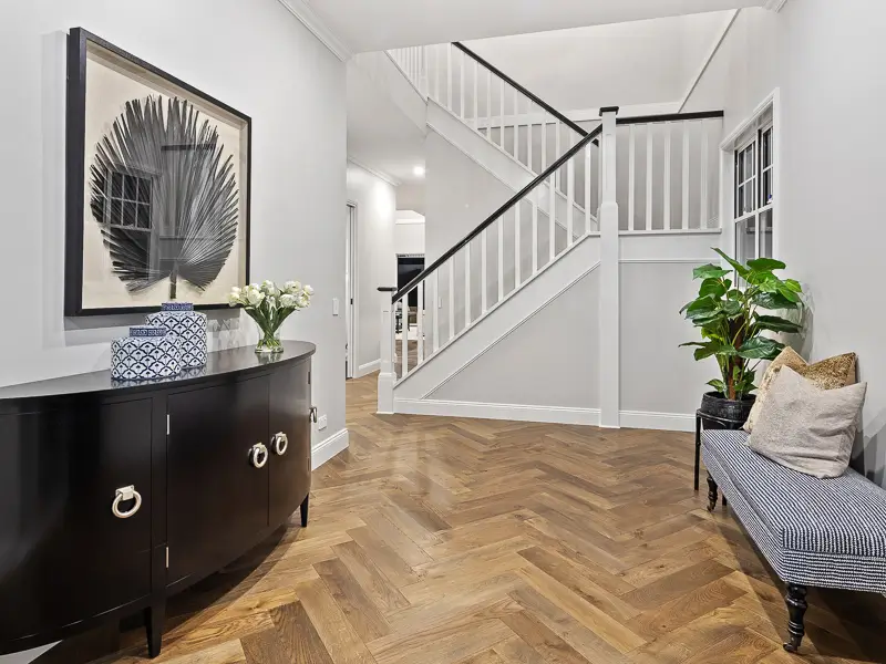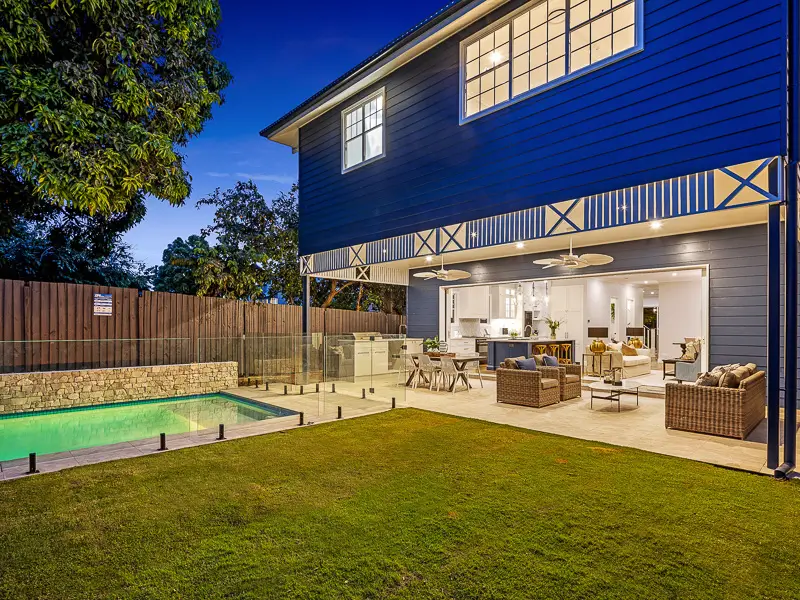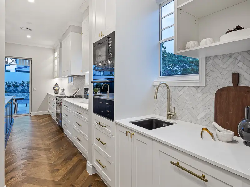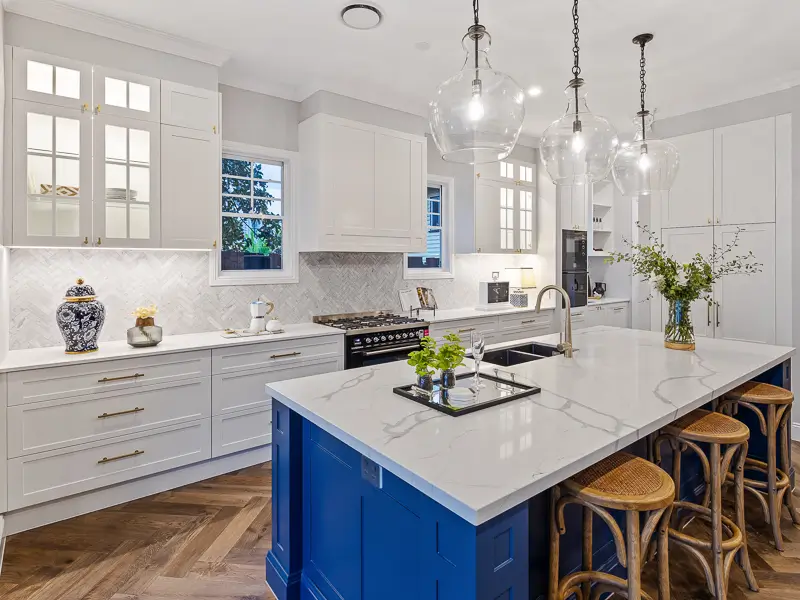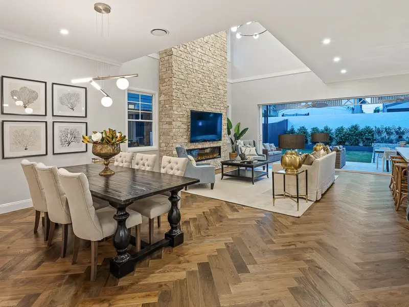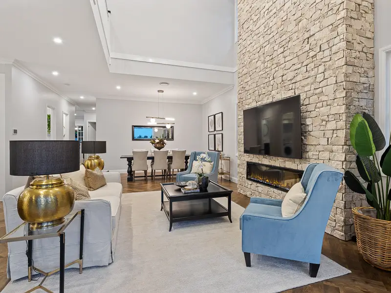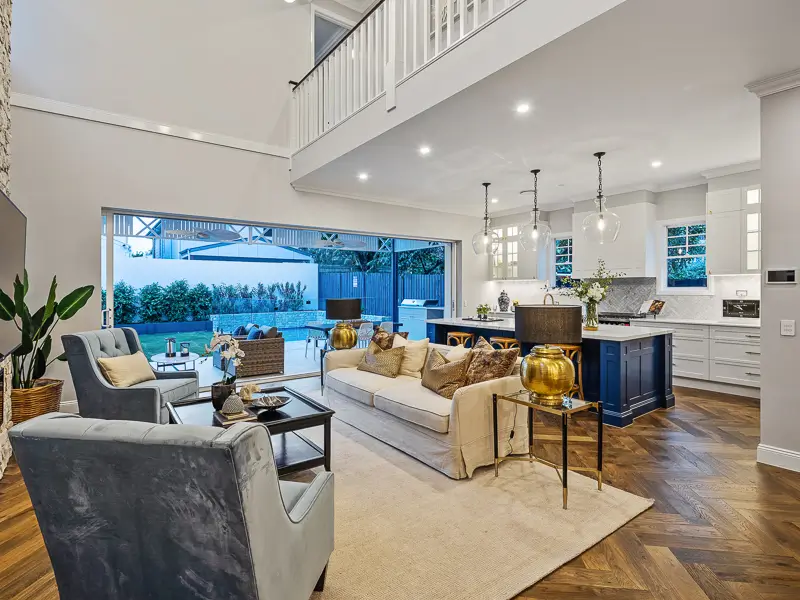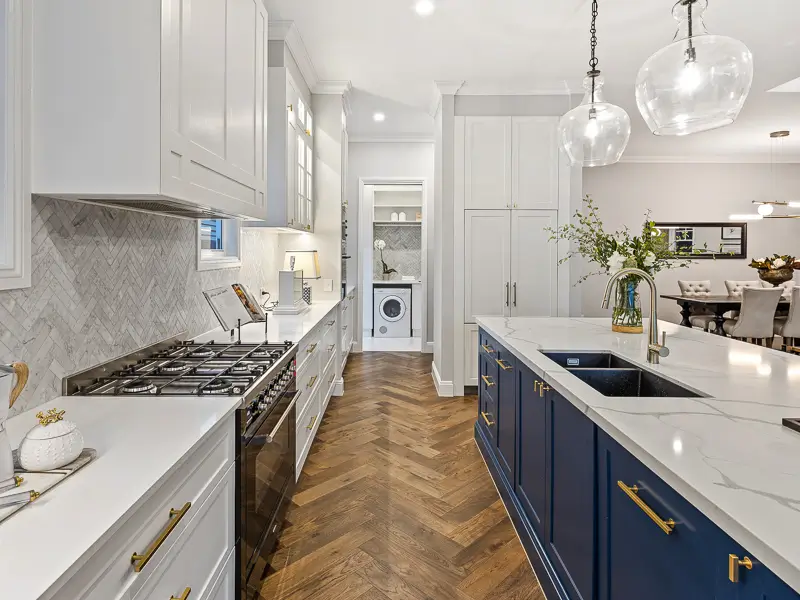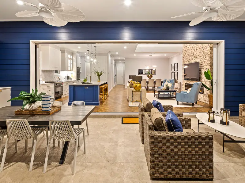 Rita House is a modern Hamptons-inspired design. Its striking facade blends modern and traditional elements with a shingle-style gable and arched window. Inside, the open-plan living area features herringbone timber flooring, a double-height ceiling, and a stone fireplace. The kitchen boasts a bold blue island and marble backsplash. A master suite with a walk-in closet and a covered alfresco with a BBQ and pool complete this luxurious home.