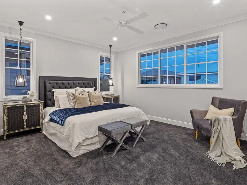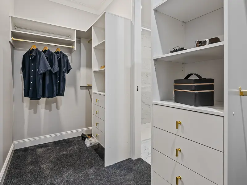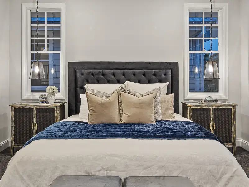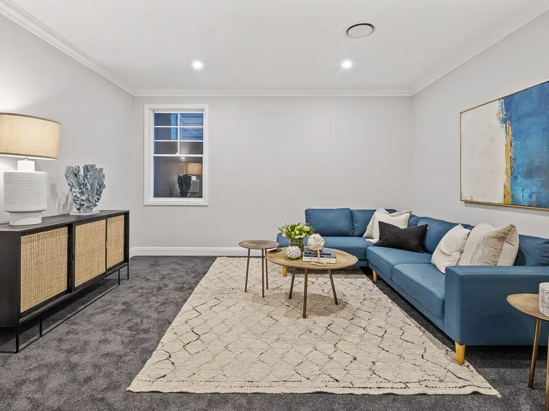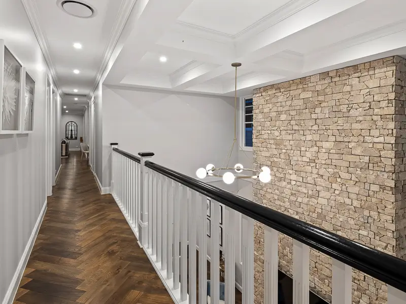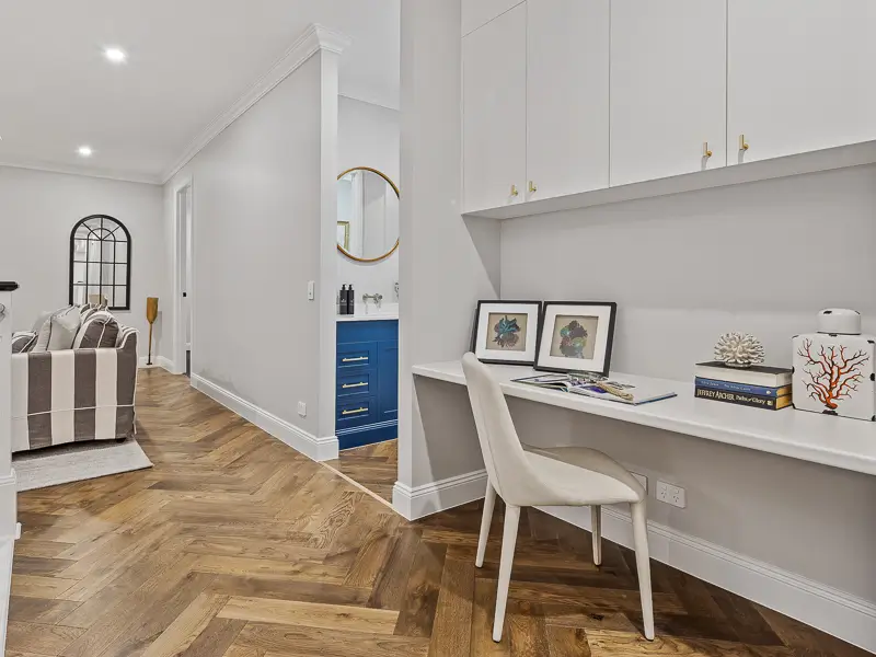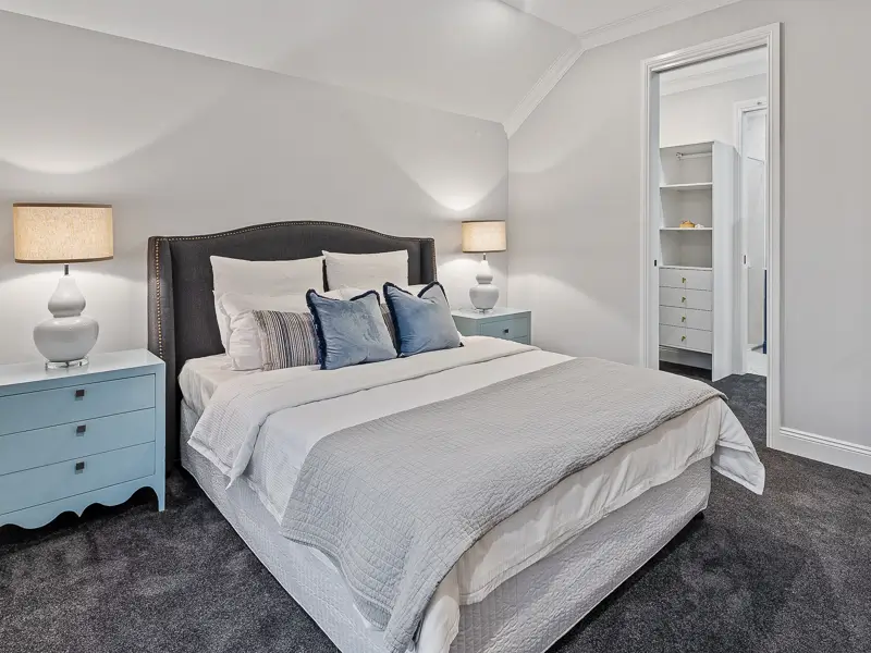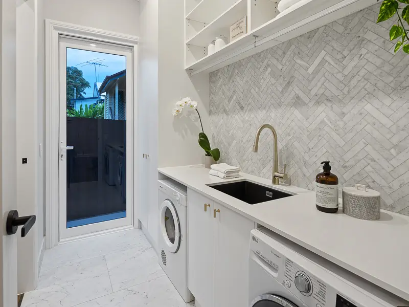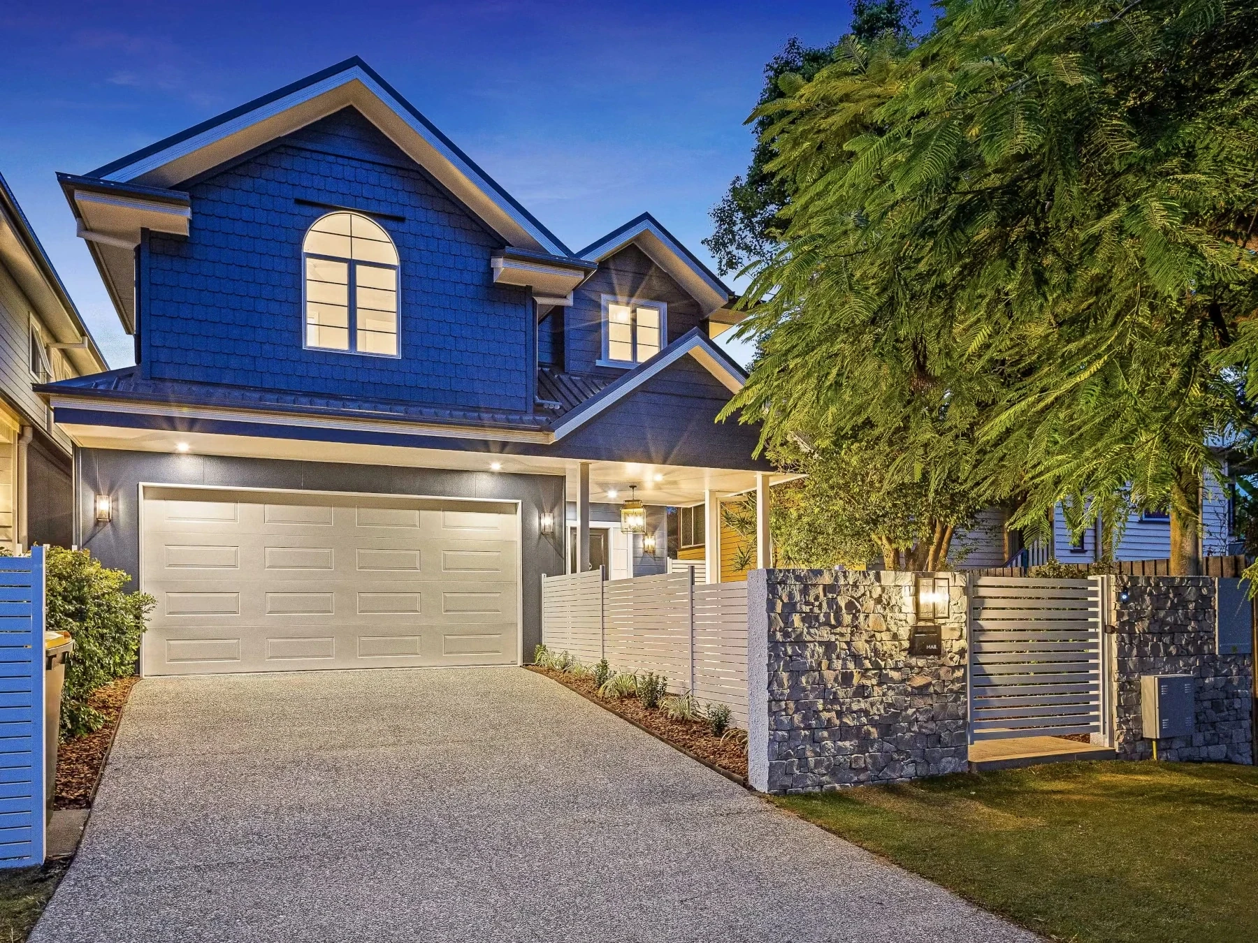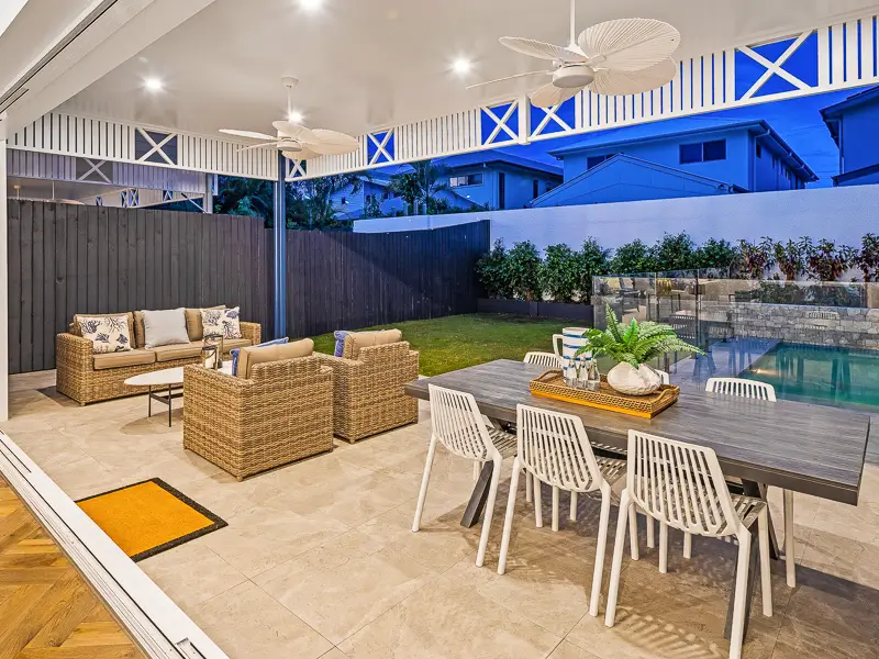 Rita House is a modern Hamptons-inspired design. Its striking facade blends modern and traditional elements with a shingle-style gable and arched window. Inside, the open-plan living area features herringbone timber flooring, a double-height ceiling, and a stone fireplace. The kitchen boasts a bold blue island and marble backsplash. A master suite with a walk-in closet and a covered alfresco with a BBQ and pool complete this luxurious home.