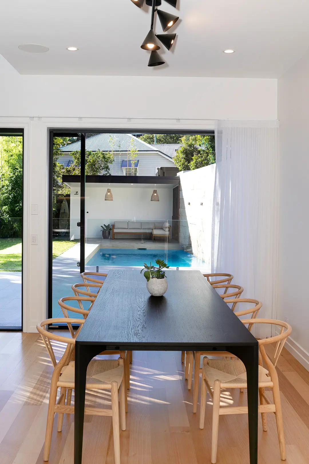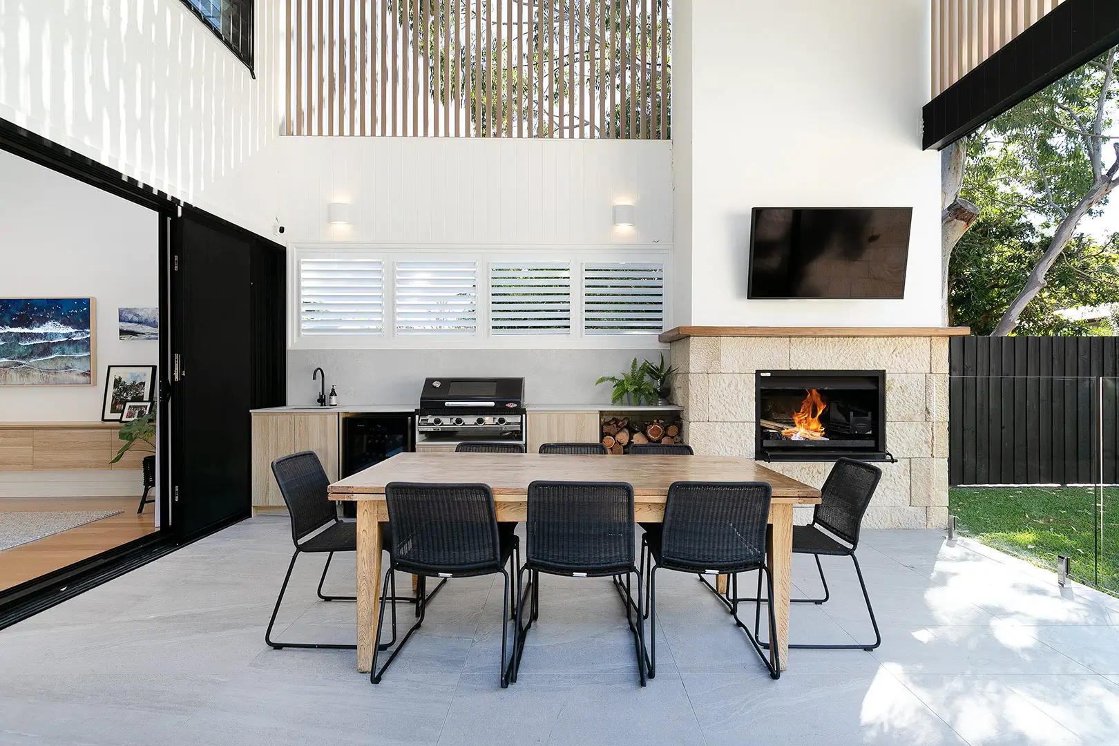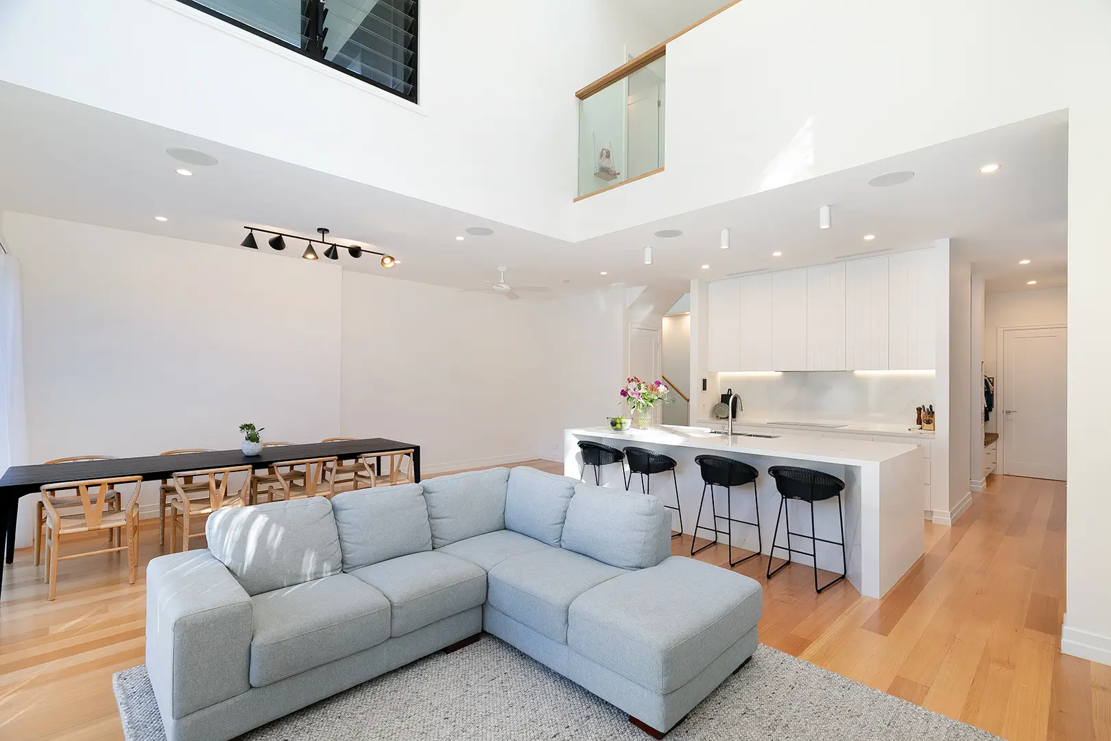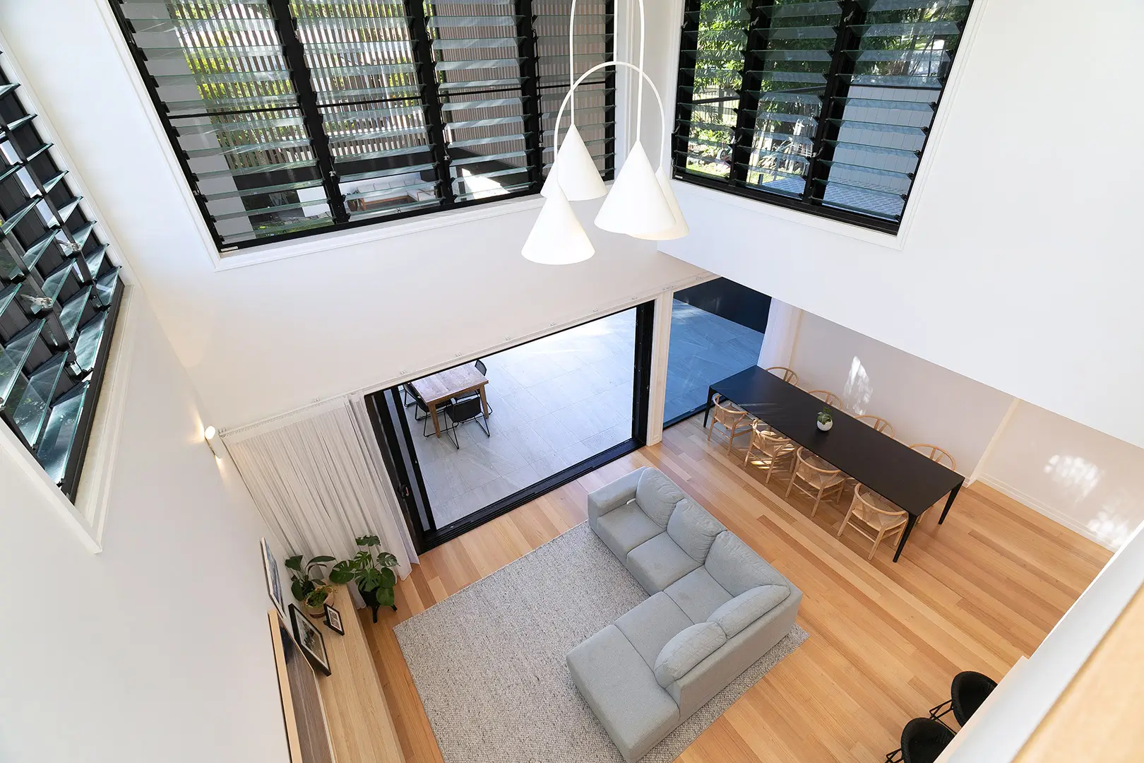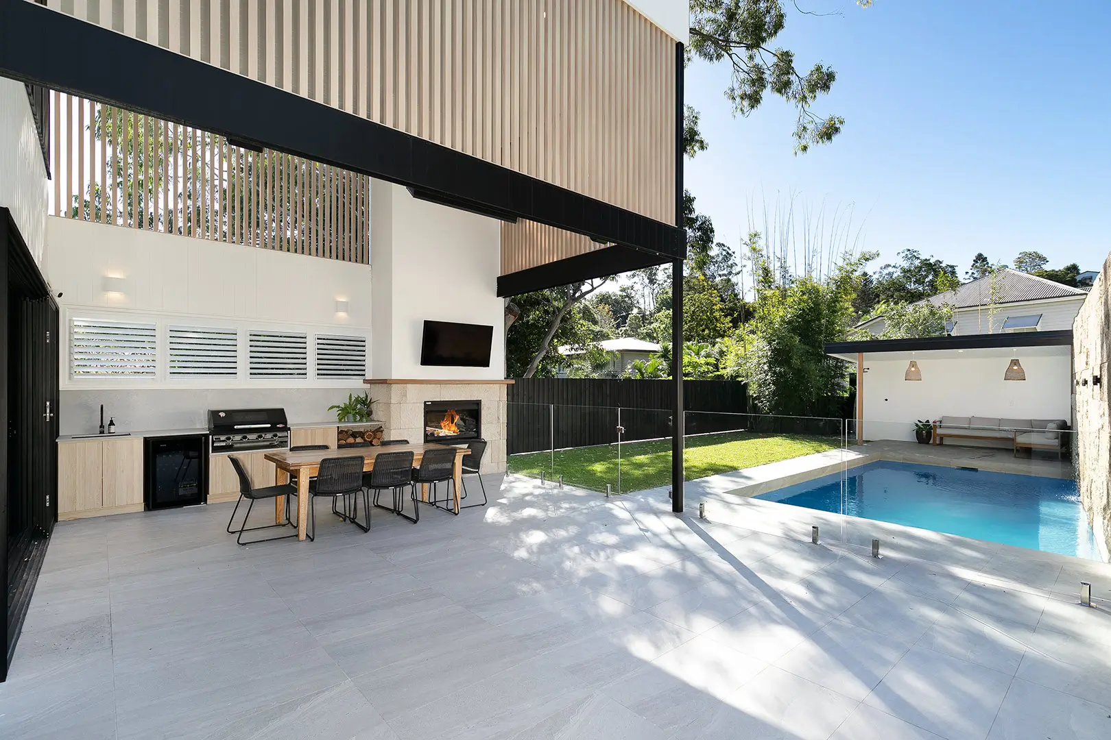 Shaw House features a sophisticated facade with timber and black tones. Inside, an airy, open-plan living area with high ceilings and large windows flows into a modern kitchen with high-end appliances. Polished timber floors and seamless indoor-outdoor connections define this elegant, functional home, complete with an upstairs family room, luxurious master suite, and an outdoor entertainment area.