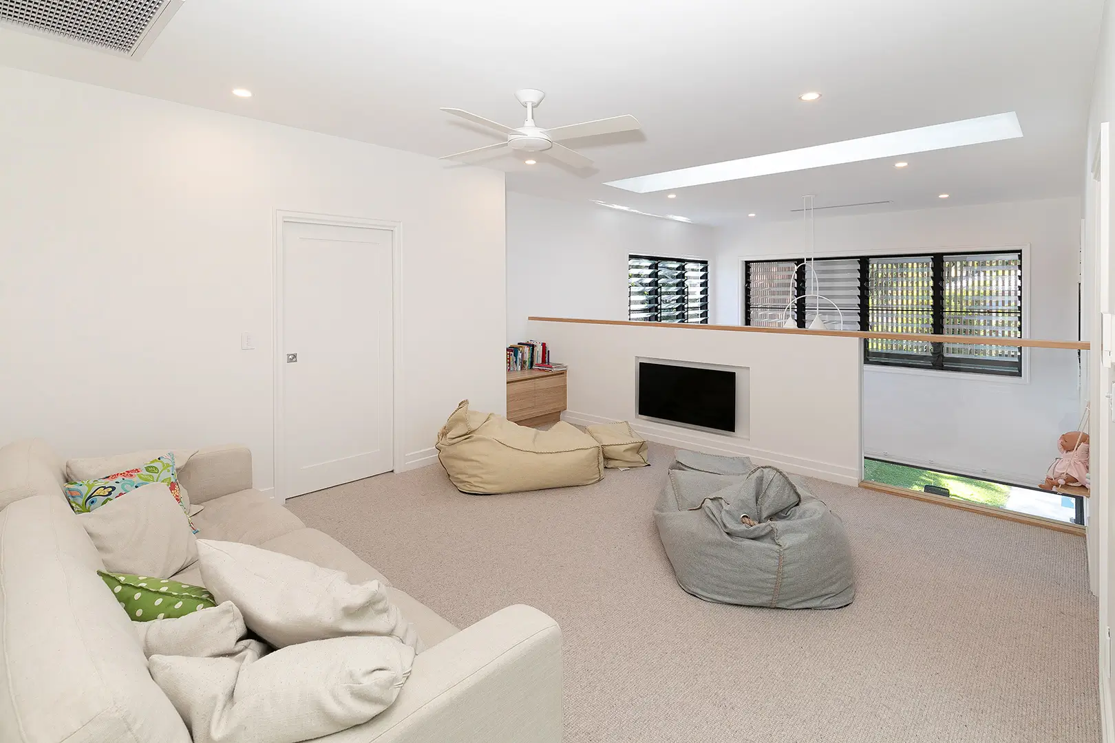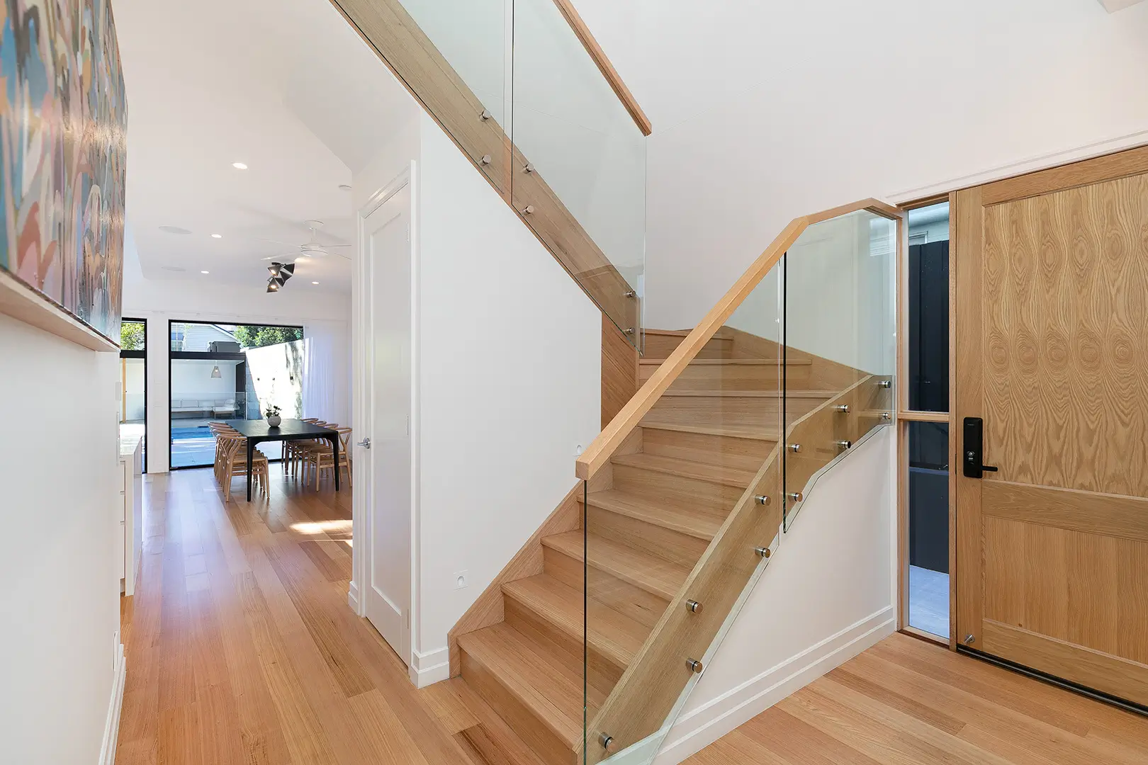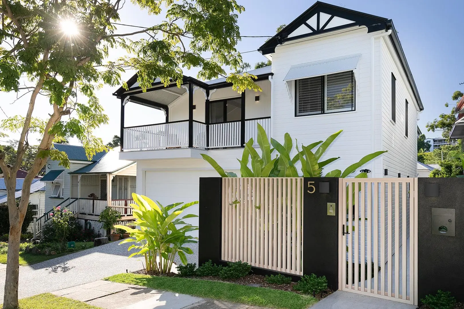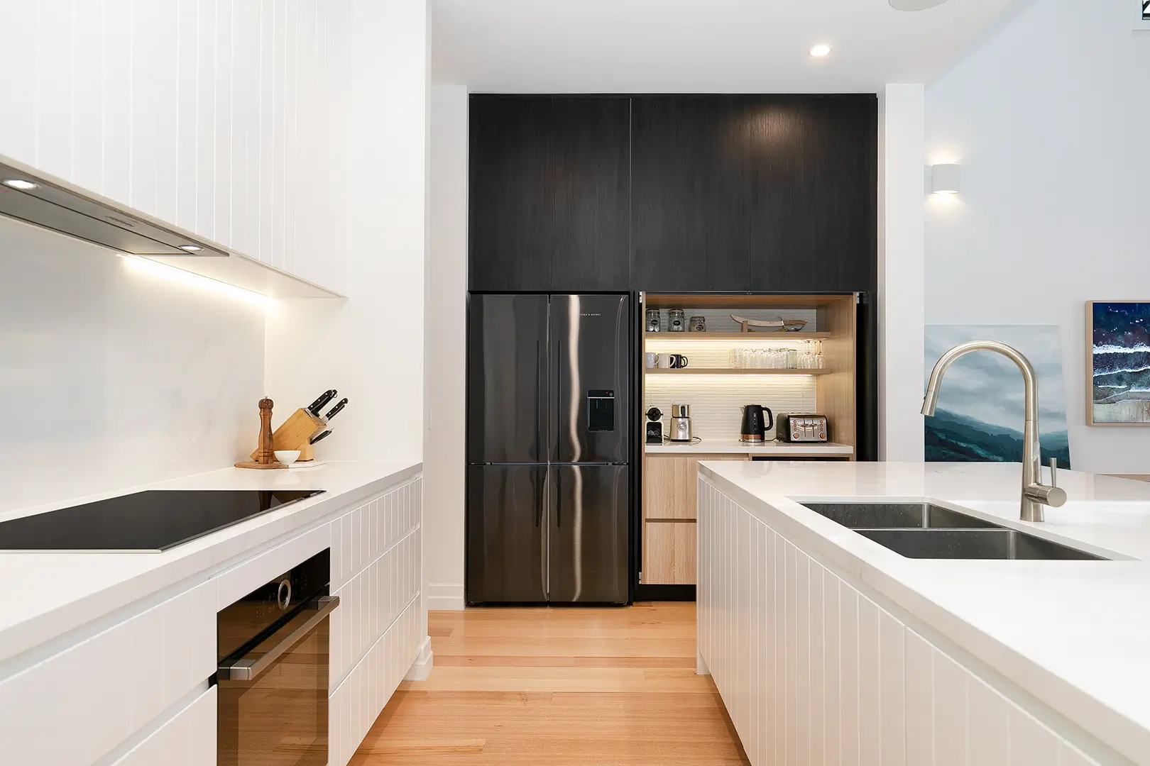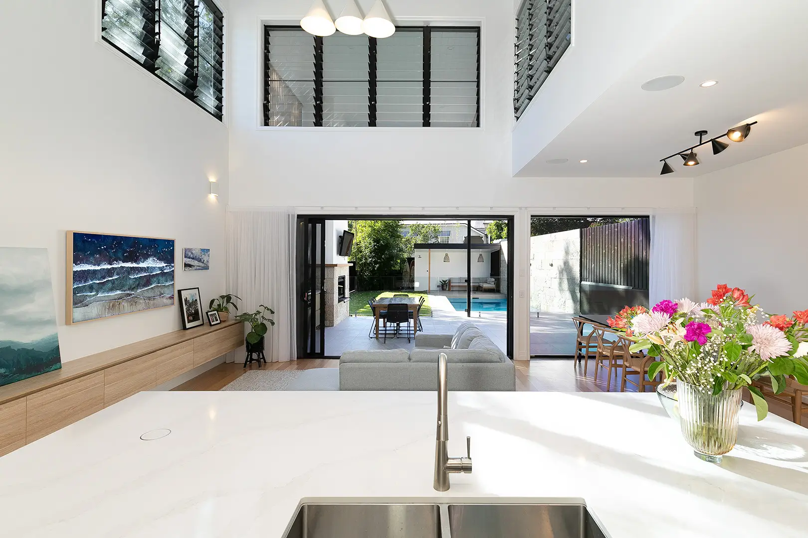 Shaw House features a sophisticated facade with timber and black tones. Inside, an airy, open-plan living area with high ceilings and large windows flows into a modern kitchen with high-end appliances. Polished timber floors and seamless indoor-outdoor connections define this elegant, functional home, complete with an upstairs family room, luxurious master suite, and an outdoor entertainment area.