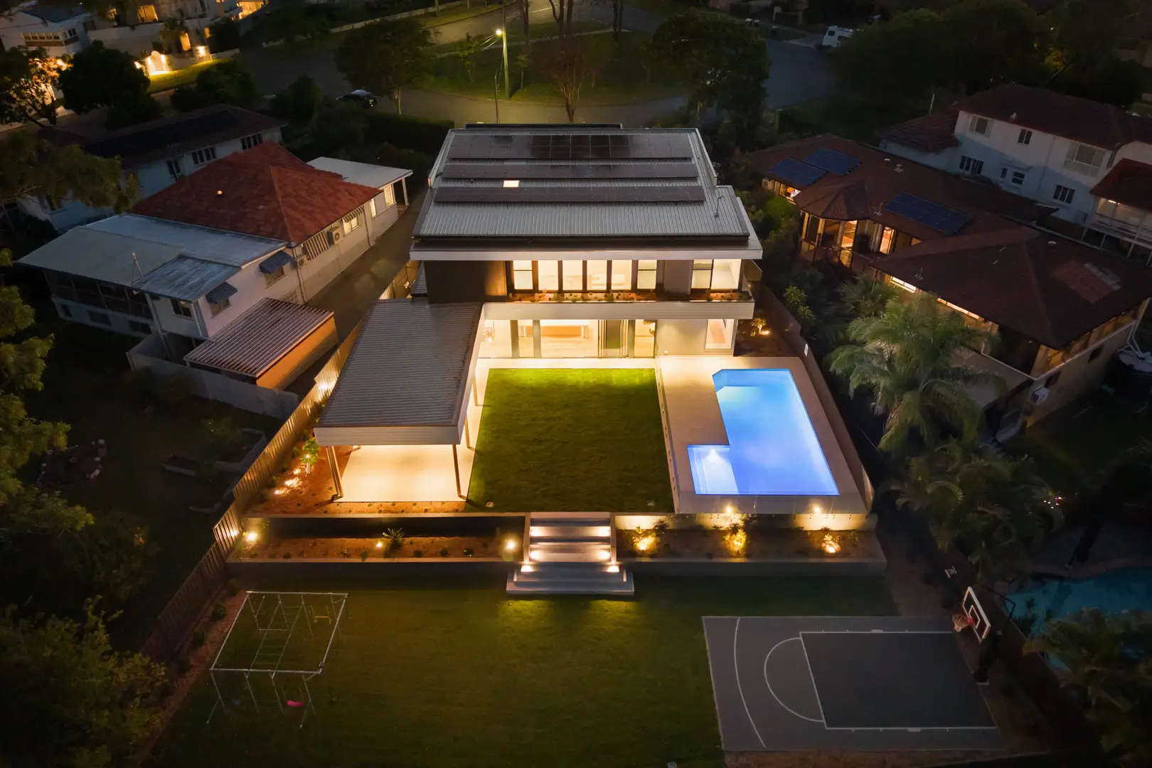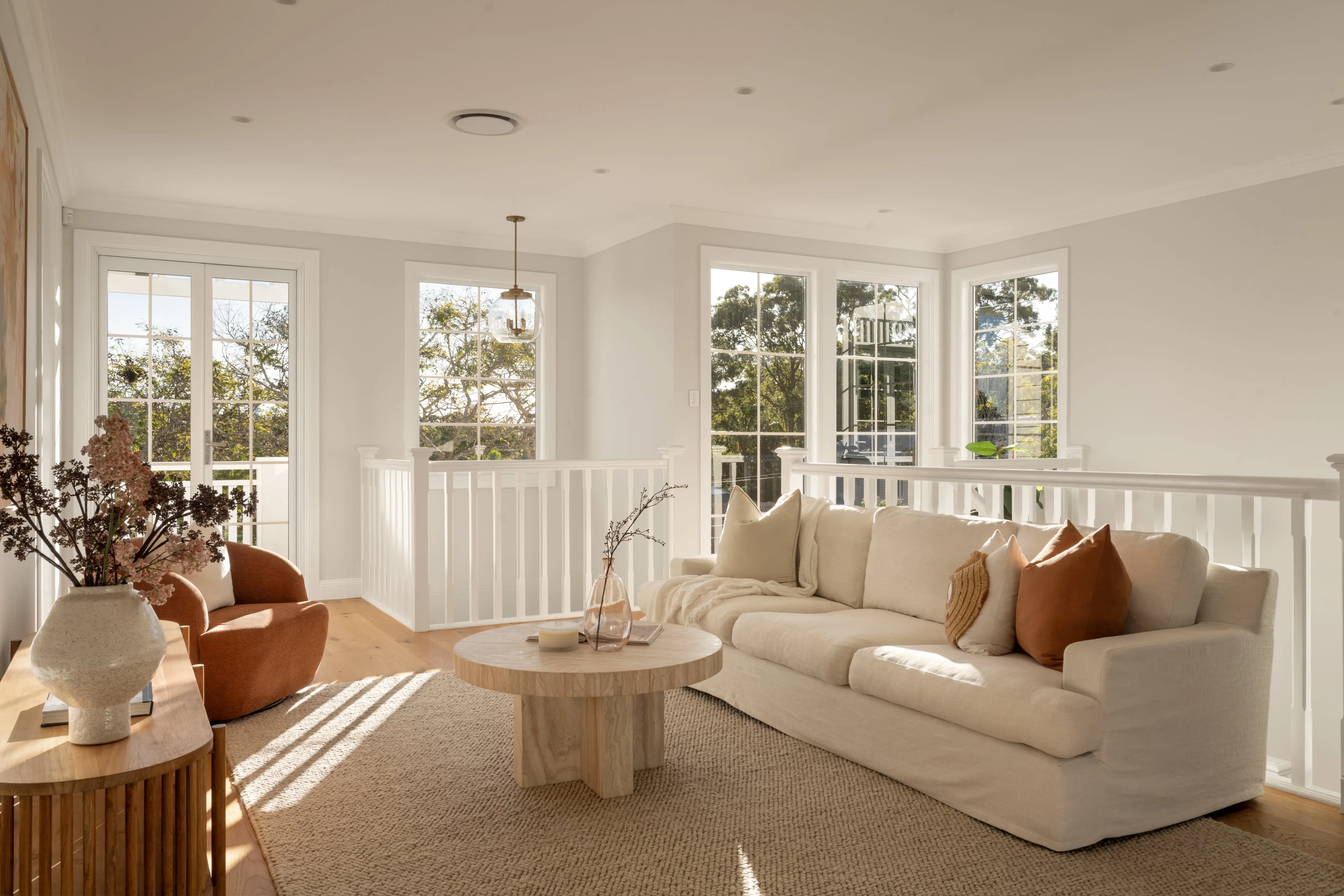 The Promenade showcases Invilla's dedication to elegant, functional design. This luxurious home blends classic and contemporary elements, featuring white weatherboard and stone accents. Inside, a double-height ceiling, stone fireplace, and herringbone floors create grandeur. An open-plan layout, high-end kitchen, and a master suite with a sunroom offer luxurious, livable spaces.