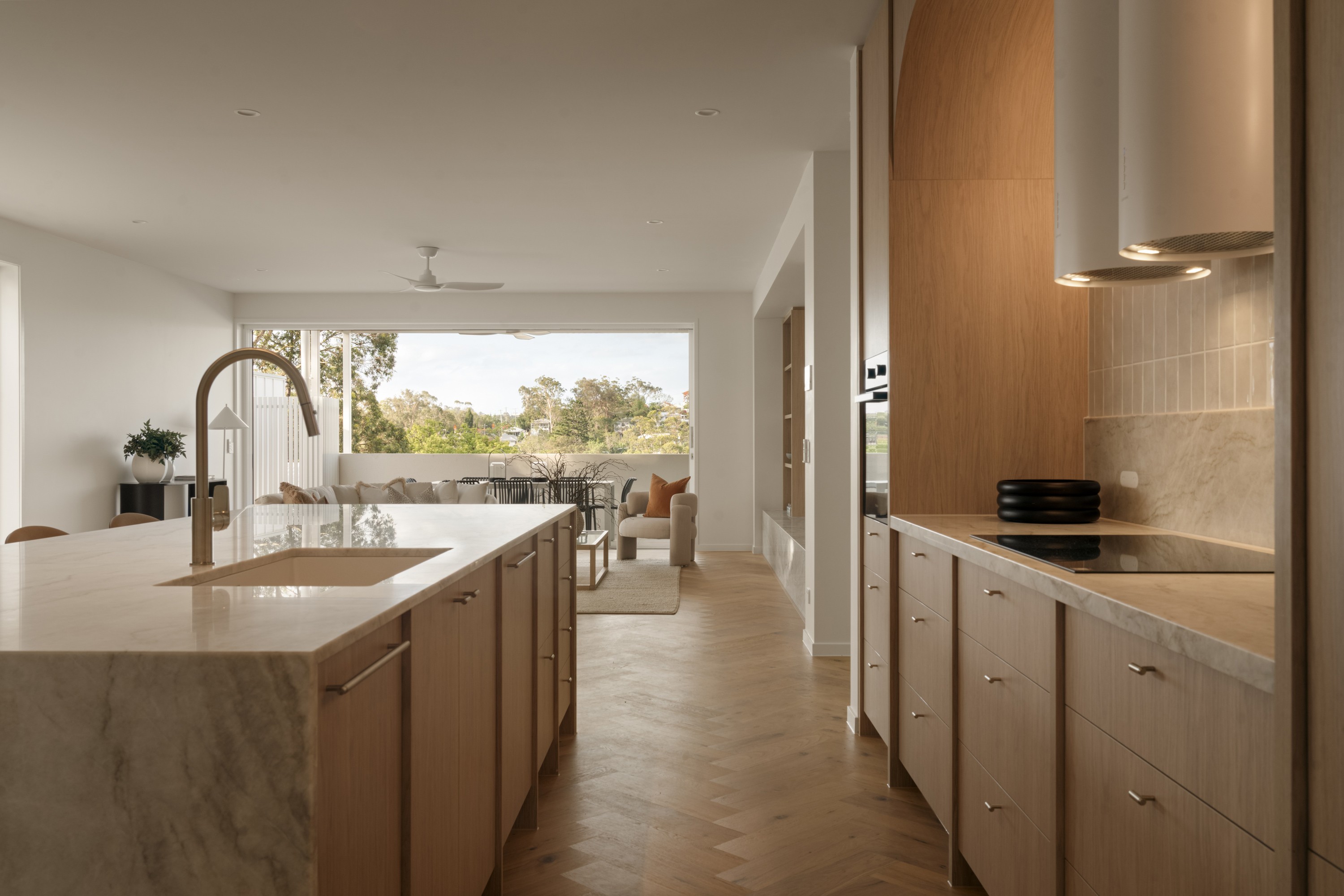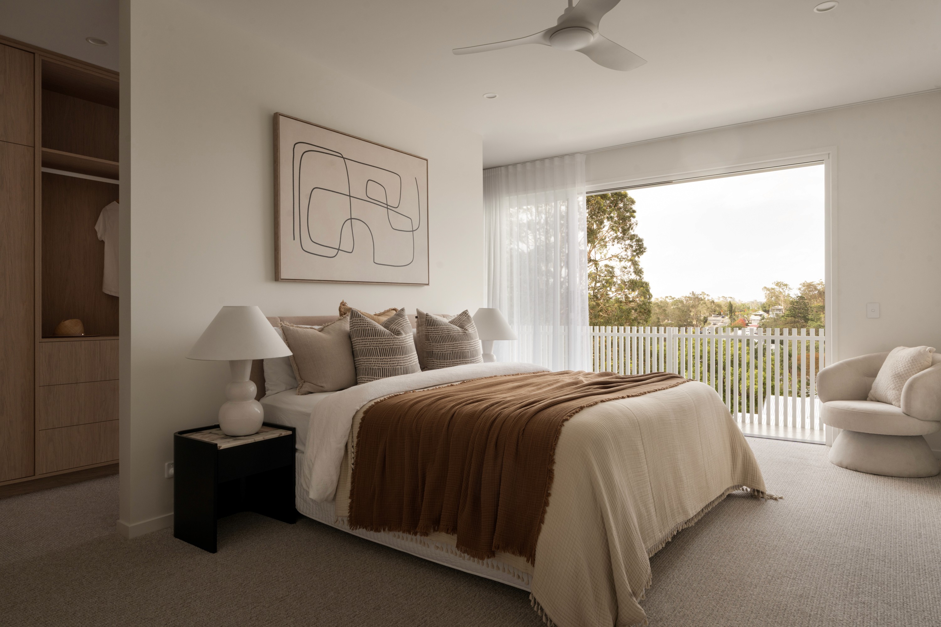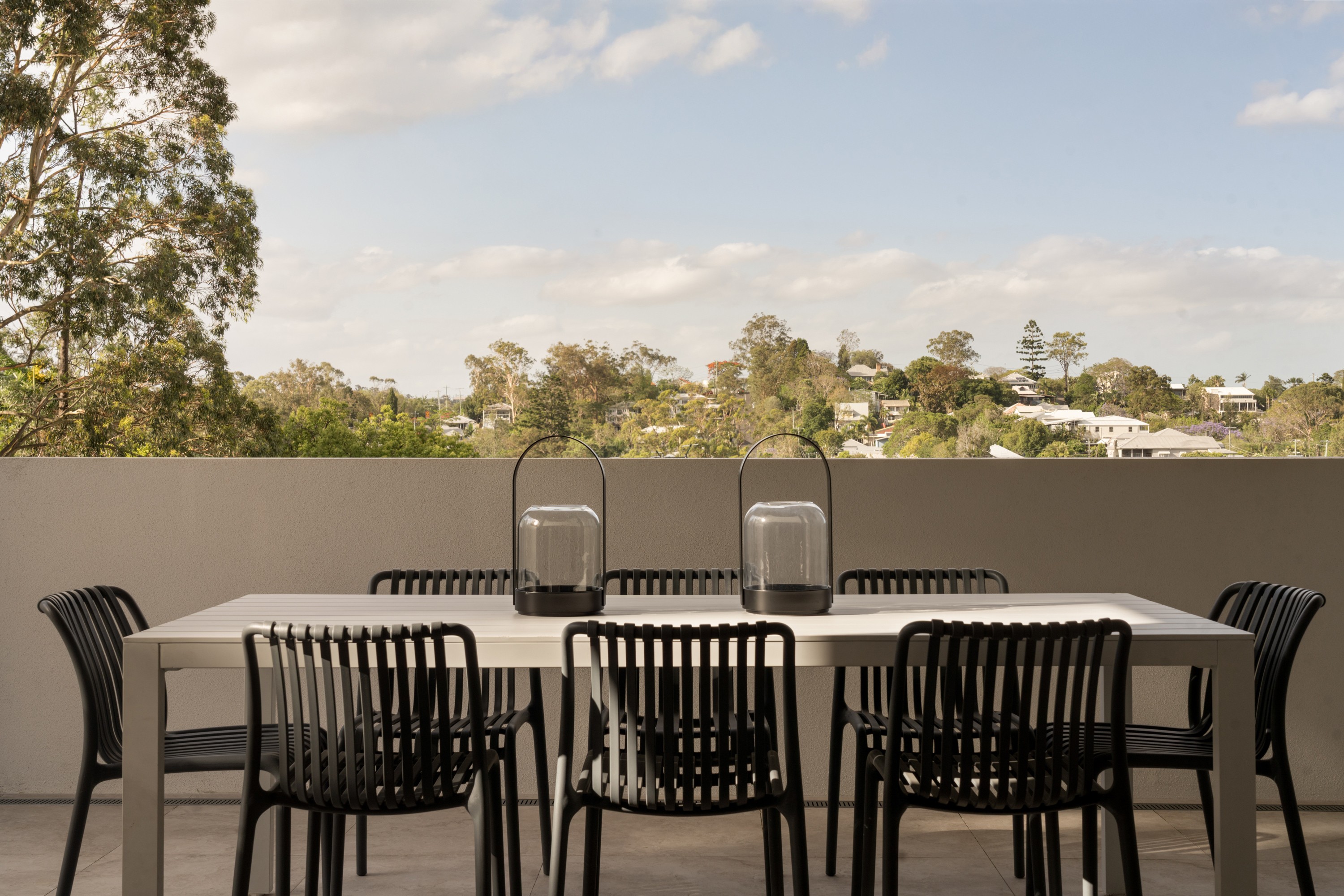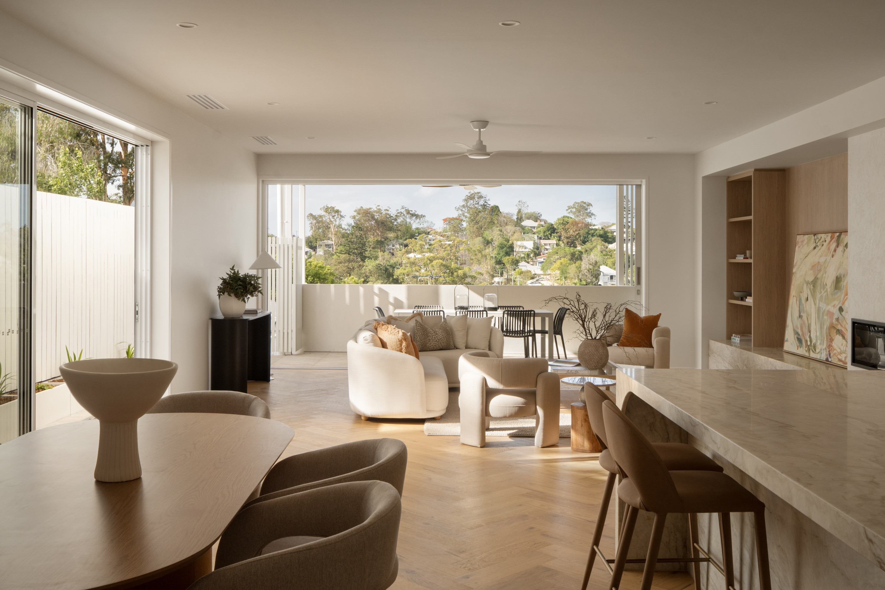 Set on a tree-lined Toowong hillside, this residence uses its northern orientation, layered levels and light-focused material palette to open the home to its landscape. The mid-level forms the social heart, where the kitchen, living and dining connect to the balcony and surrounding canopy, with practical spaces sitting quietly behind the scenes. A second living space above leads to an alfresco terrace and pool, a setting shaped for Brisbane’s climate and everyday gathering. Five bedrooms and three skylit bathrooms occupy the upper level, with the primary suite positioned to meet the treetops each morning.